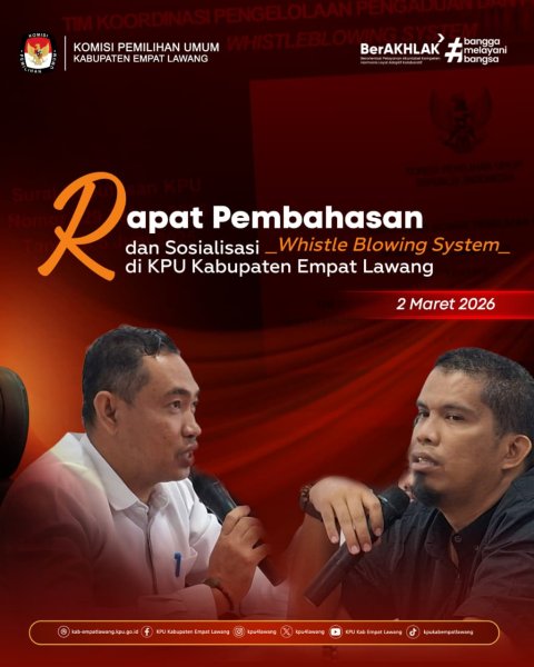 #temanpemilih KPU Kabupaten empat lawang melaksanakan Rapat Pembahasan dan Sosialisasi Whistle Blowing System di KPU Kabupaten Empat Lawang (02/3/2026) Kegiatan ini untuk mendukung terwujudnya tata kelola pemerintahan yang jujur, bersih, transparan dan pelayanan publik yang berkualitas sesuai prinsip-prinsip penyelenggaraan pemerintahan yang baik, KPU Kabupaten Empat Lawang memfasilitasi informasi dan sosialisasi mengenai pelaporan WBS KPU RI. Sistem ini (WBS) bertujuan untuk menampung, menindaklanjuti lapran dan memberikan perlindungan serta menjaga kerahasiaan identitas pelapor dari ancaman. #KPUMelayani ....