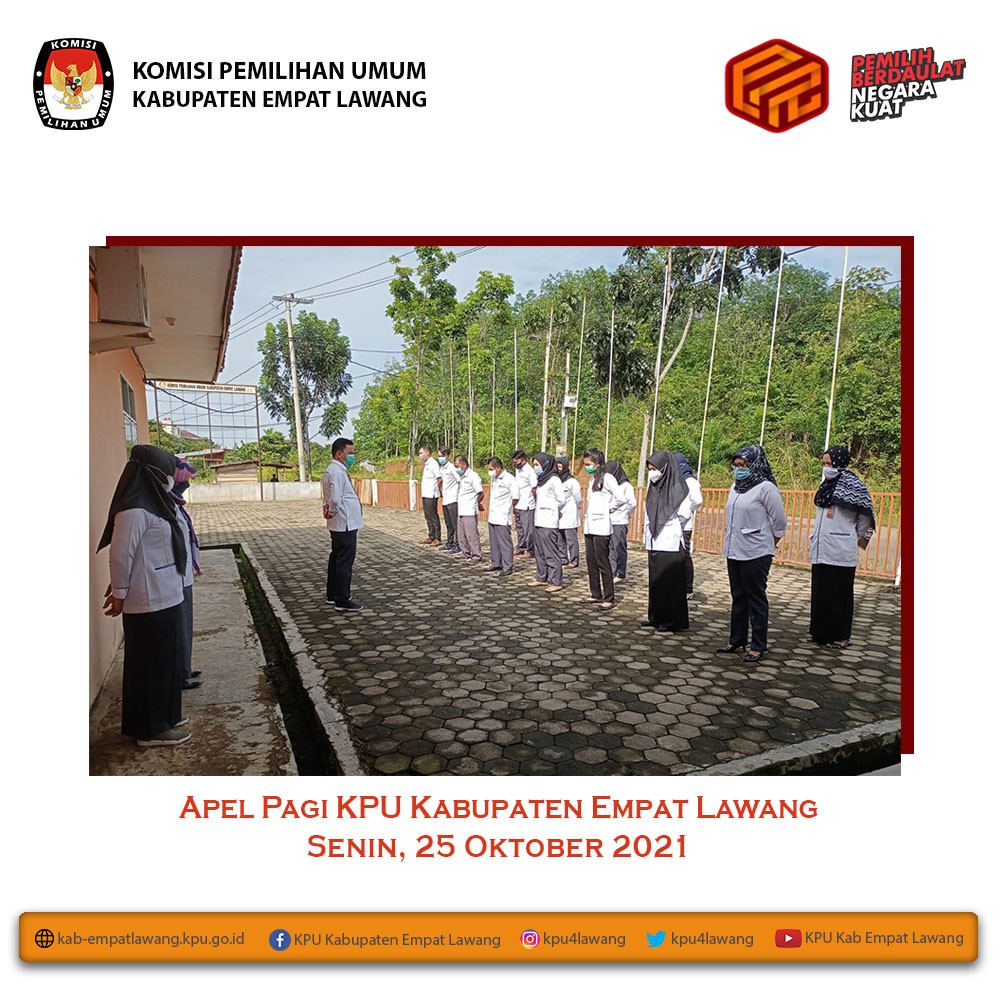 Apel Pagi KPU Kabupaten Empat Lawang setiap hari Senin. Apel dipimpin oleh Sekretaris KPU Kab Empat Lawang (Misran Ayudi, S.H.) dan diikuti oleh Para Sub Koordinator, serta Staf Fungsional dan Honorer Sekretariat KPU Kabupaten Empat Lawang. Apel dilaksanakan pada pukul 08.00 WIB s.d selesai.