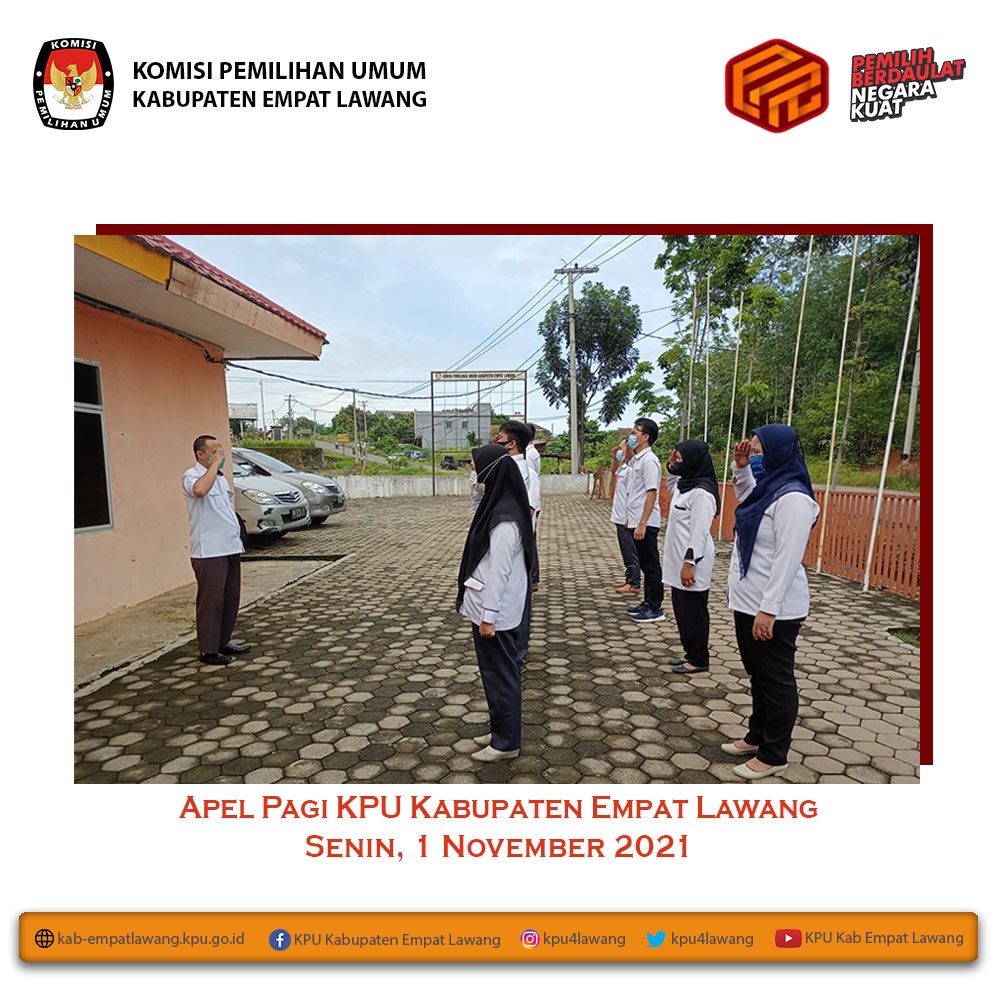 Apel Pagi KPU Kabupaten Empat Lawang setiap hari Senin. Apel dipimpin oleh Sub Koordinator Sub Bagian Teknis Pemilu dan Hupmas (Yance Martin, S.H.) dan diikuti oleh Staf Fungsional dan Honorer Sekretariat KPU Kabupaten Empat Lawang. Apel dilaksanakan pada pukul 08.00 WIB s.d selesai.
