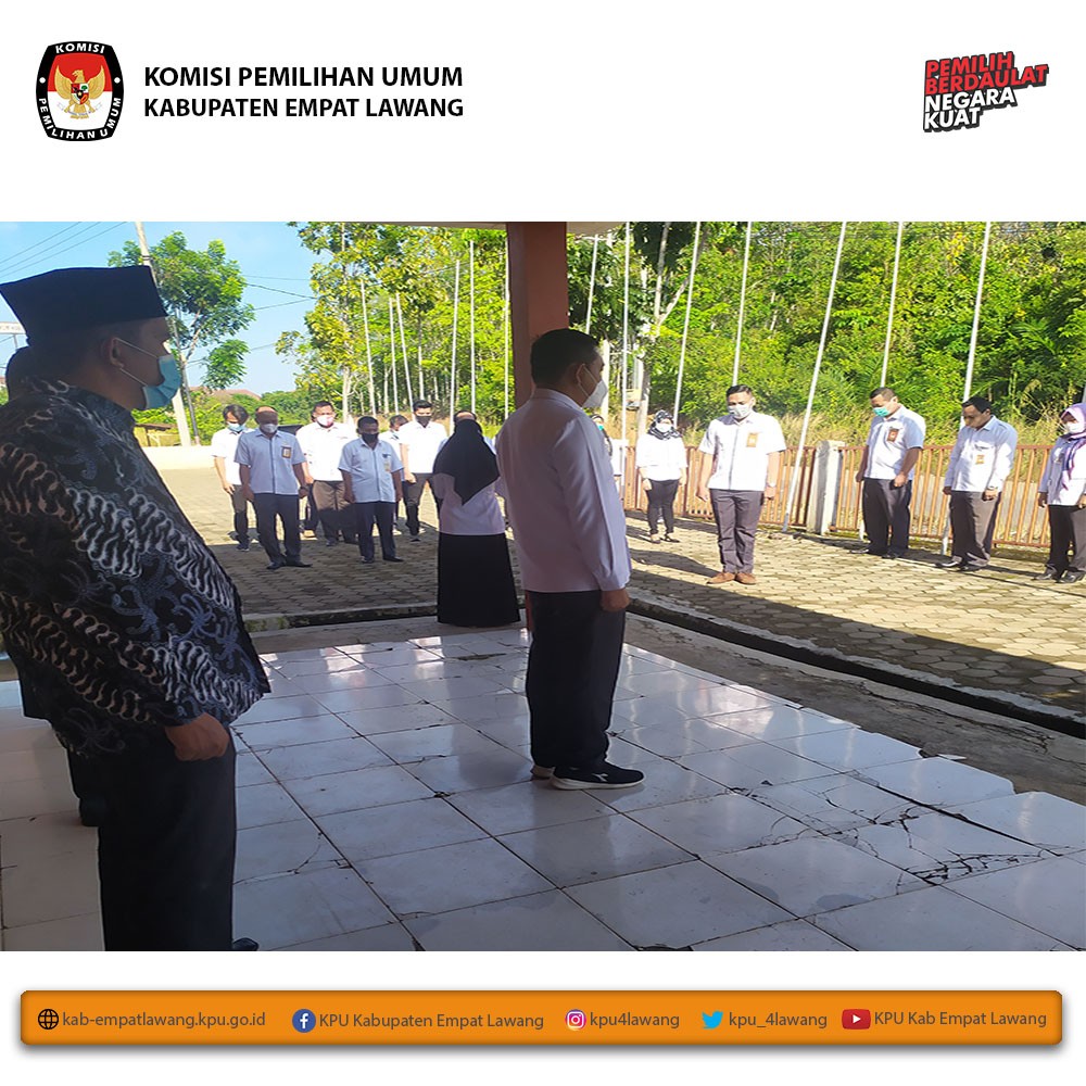 Pelaksanaan Apel Pagi rutin setiap hari Senin KPU Kabupaten Empat Lawang. Apel Pagi kali ini dipimpin oleh Ketua KPU Kab Empat Lawang (Eskan Budiman, S.Pd.) dan diikuti oleh Anggota KPU Kab Empat Lawang, Sekretaris dan Para Sub Koordinator, serta Staf Fungsional dan Honorer Sekretariat KPU Kab Empat Lawang. Apel dimulai pukul 08.00 WIB s.d selesai.