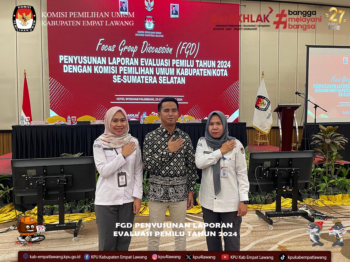 #TemanPemilih, KPU Kabupaten Empat Lawang mengikuti Kegiatan Focus Group Discussion penyusunan laporan evaluasi Pemilu Tahun 2024 bersama KPU Kabupaten/Kota se-Sumsel di Hotel Wyndham, Rabu (25/9/2024).