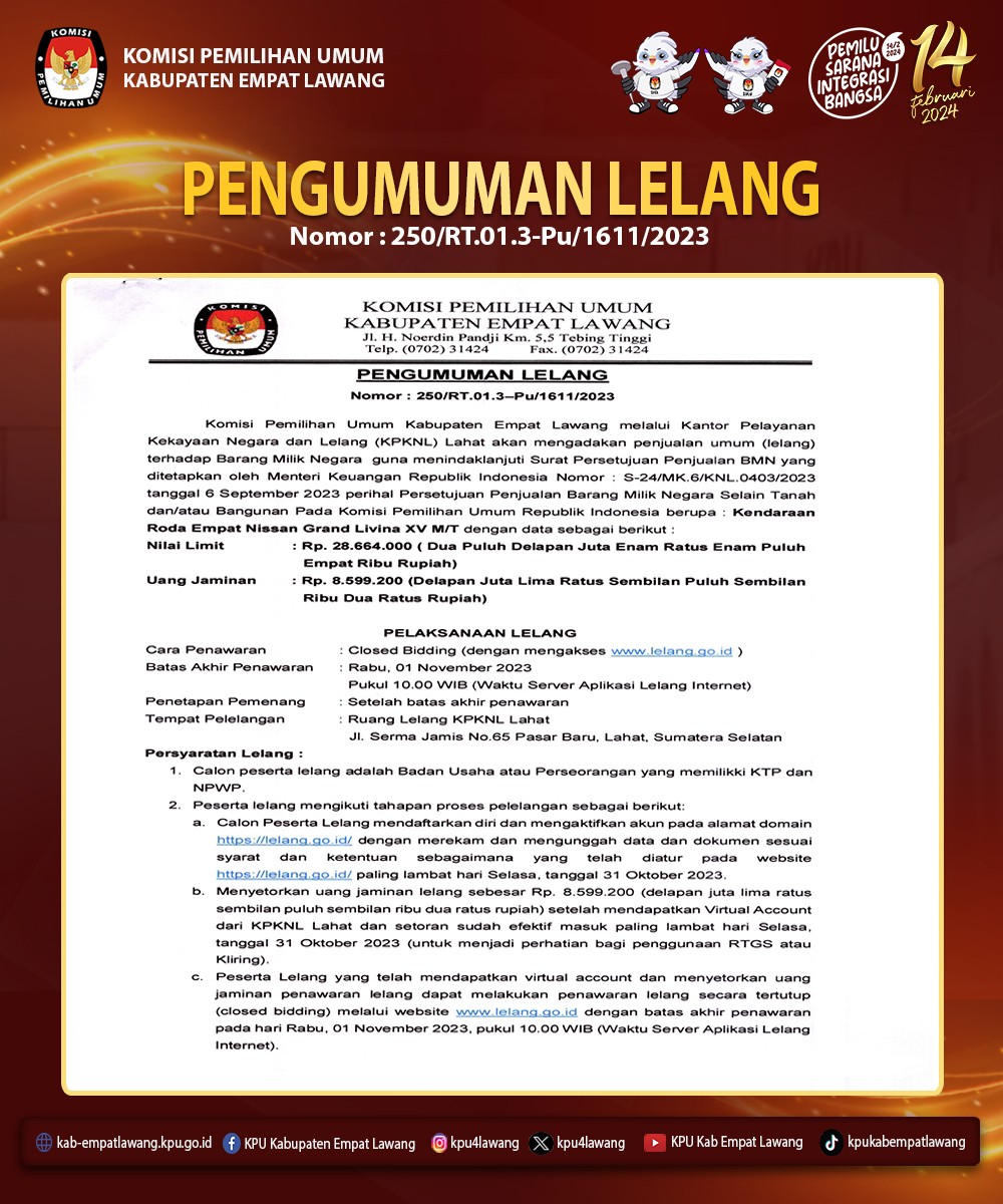 #TemanPemilih, berikut Pengumuman Lelang terhadap Barang Milik Negara KPU Kabupaten Empat Lawang. Selengkapnya dapat diunduh pada link dibawah :