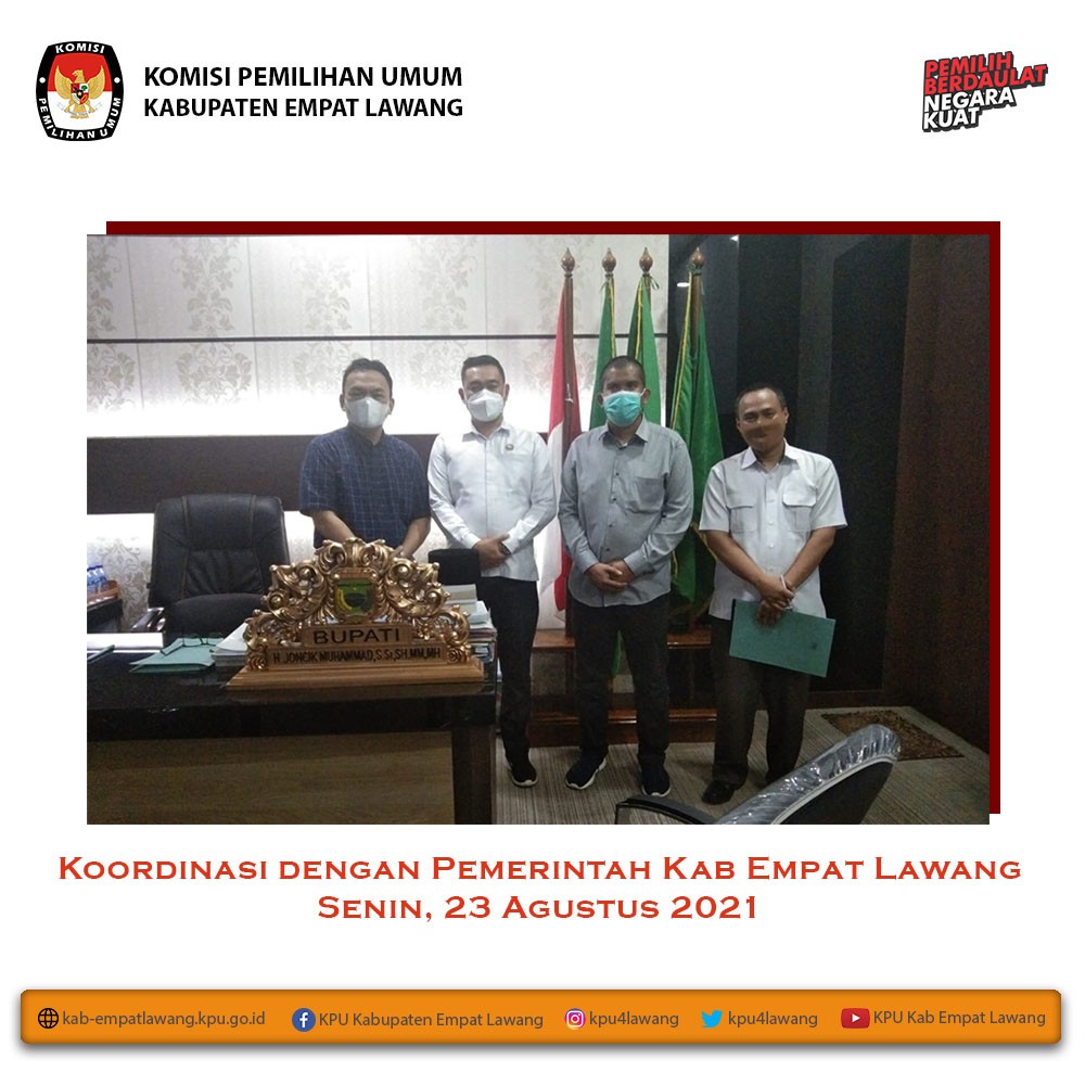 KPU Kabupaten Empat Lawang melakukan koordinasi dengan Pemerintah Kabupaten Empat Lawang dalam hal ini Bupati Empat Lawang H. Joncik Muhammad, S.Si, SH, MM, MH terkait Surat Komisi Pemilihan Umum Republik Indonesia Nomor 754/PP.07-SD/06/KPU/VIII/2021 perihal Pendataan Wilayah Administrasi untuk Persiapan Penataan Dapil.