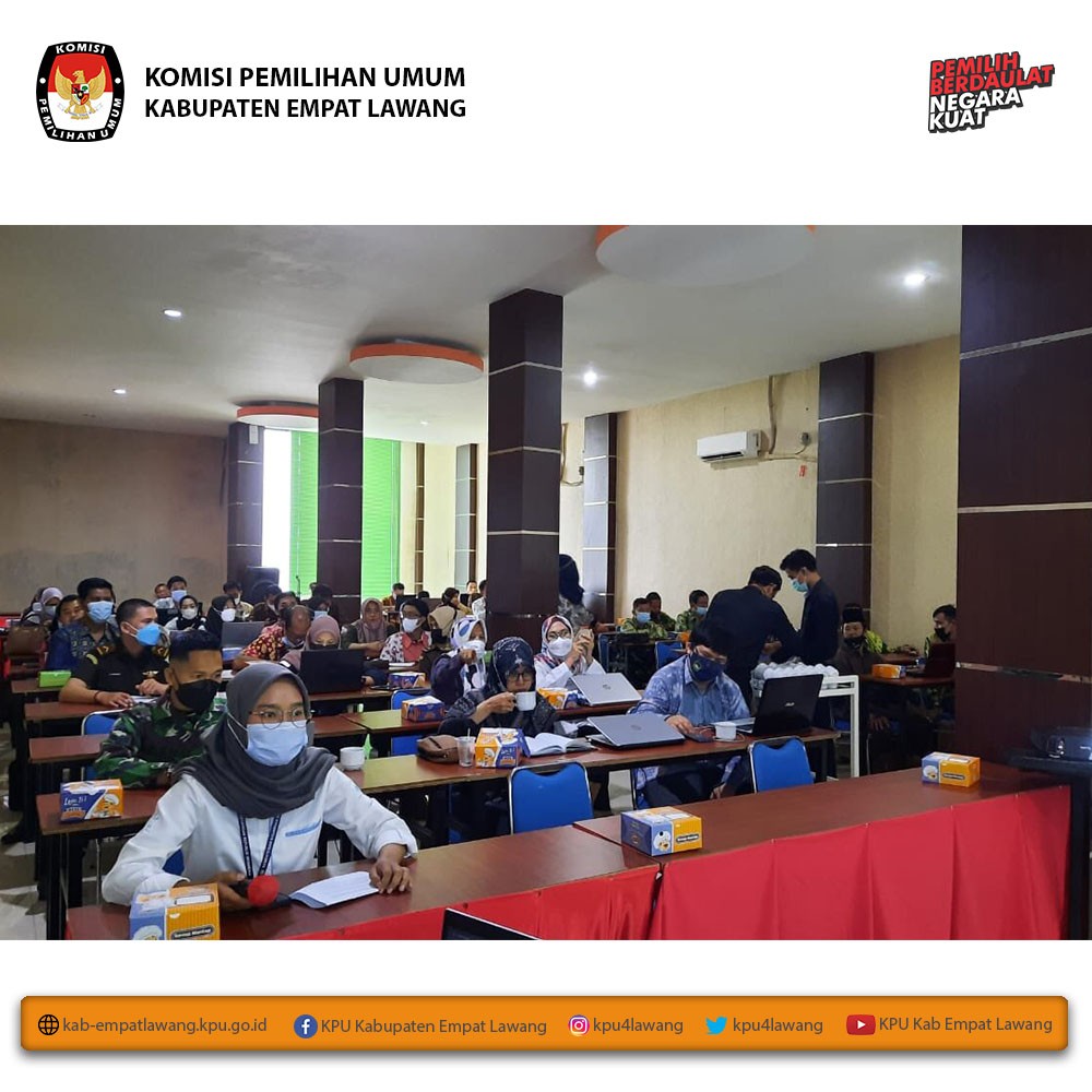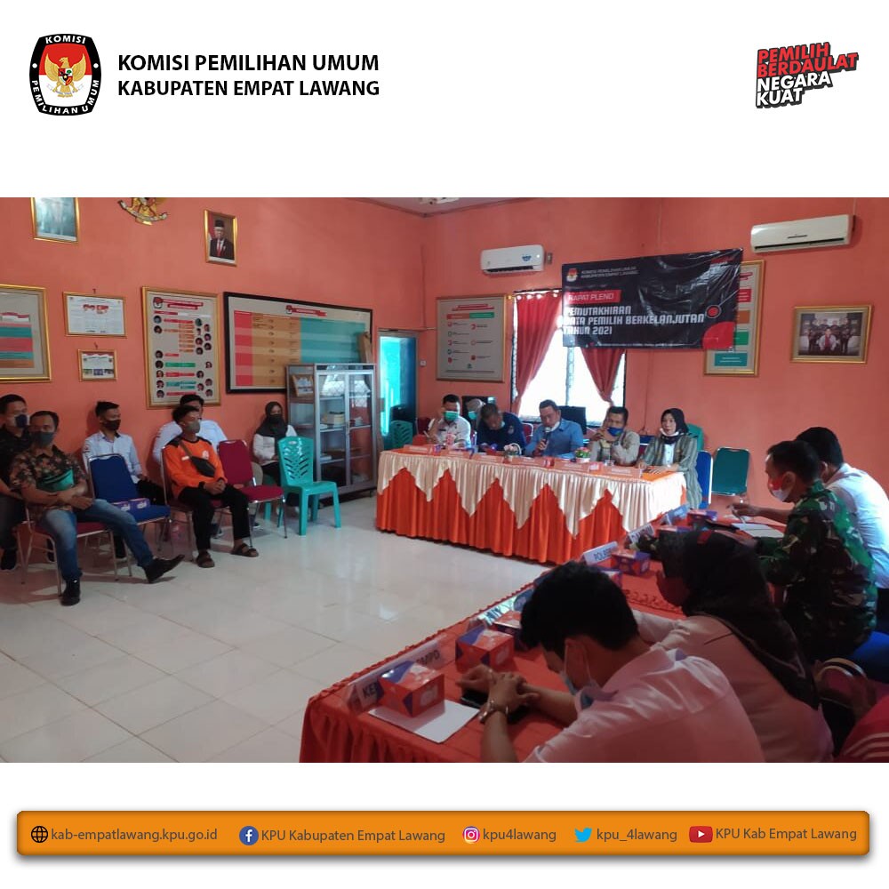 KPU Kabupaten Empat Lawang mengadakan Rapat Koordinasi Rekapitulasi Pemutakhiran Data Pemilih Berkelanjutan Periode Juni 2021 dan Rapat Pleno Rekapitulasi Pemutakhiran Data Pemilih Berkelanjutan Triwulan II. Acara diadakan dimulai pukul 10.00 WIB s.d selesai, dihadiri oleh Bawaslu Kab Empat Lawang, Dandim 0405 Lahat, Polres Empat Lawang, Kesbangpol Empat Lawang, Disdukcapil Kab Empat Lawang dan Partai Politik.
