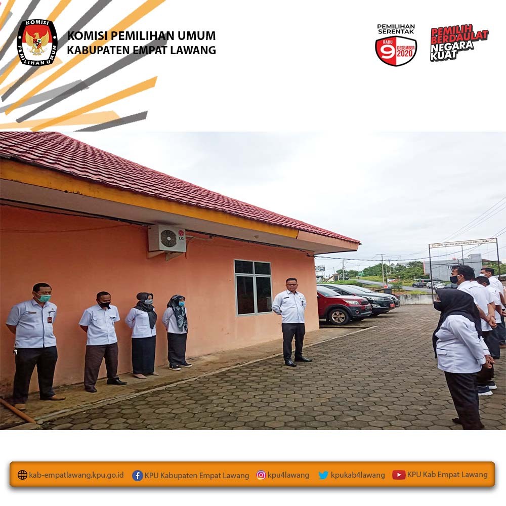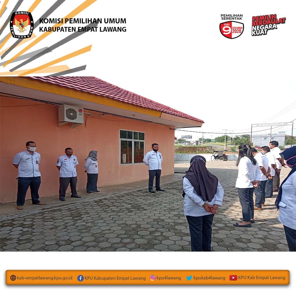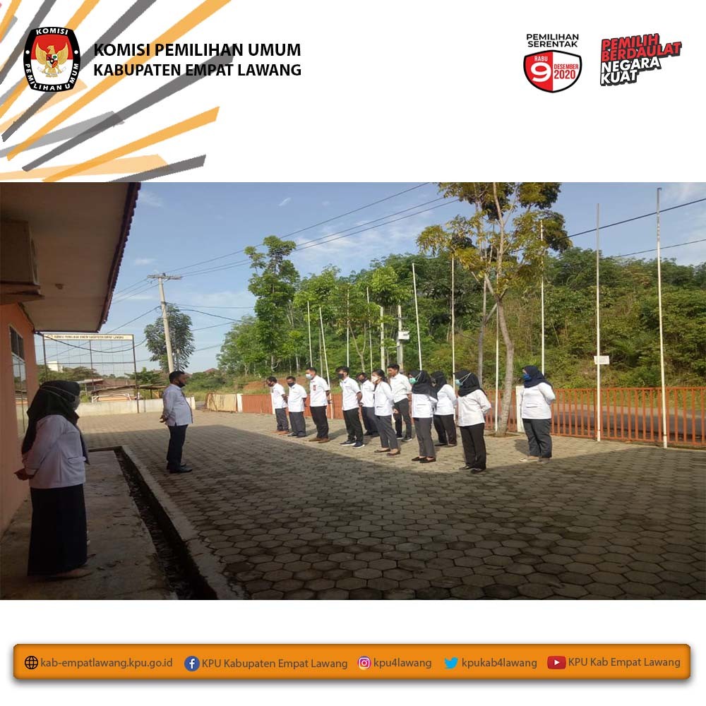 Apel dipimpin oleh Sekretaris (Misran Ayudi, S.H.) yang diikuti oleh Para Kasubbag dan Para Staf Fungsional dan Honorer di Lingkungan Sekretariat KPU Kabupaten Empat Lawang. Apel dimulai Pukul 08.00 WIB s.d selesai dimana dalam amanatnya menyampaikan terimakasih atas kinerja, intergritas, kedisiplinan, serta memberikan arahan untuk kegiatan rapat pleno DPT berkelanjutan bulan September, mengingatkan kepada seluruh pegawai KPU kabupaten Empat Lawang dengan kewajiban tugas-tugas, dan mematuhi tatanan kerja normal baru.