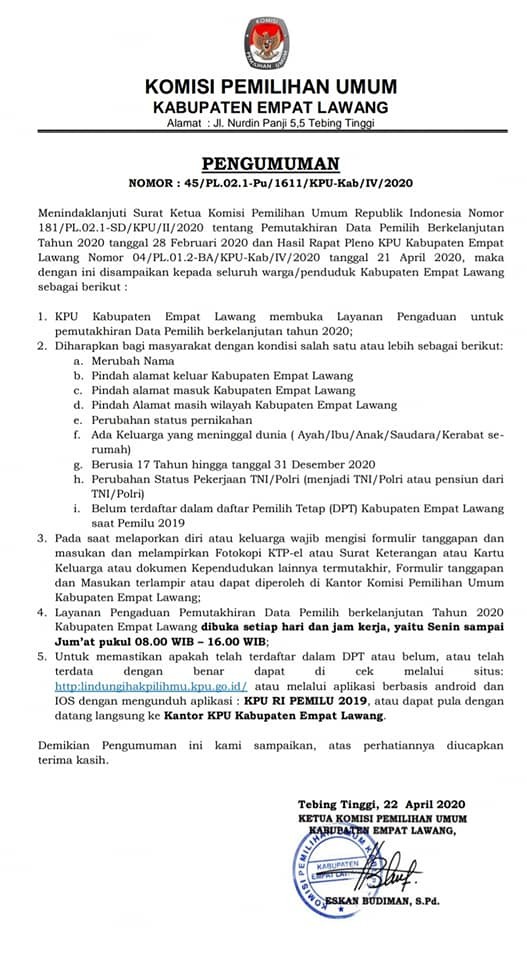 Pengumunan Pelayanan Pengaduan Untuk Pemuktahiran Data Pemilih Berkelanjutan Tahun 2020 Sabtu, 21 Maret 2020 08:43 54 Pengumunan Pelayanan Pengaduan Untuk Pemuktahiran Data Pemilih Berkelanjutan Tahun 2020 Baca Selengkapnya