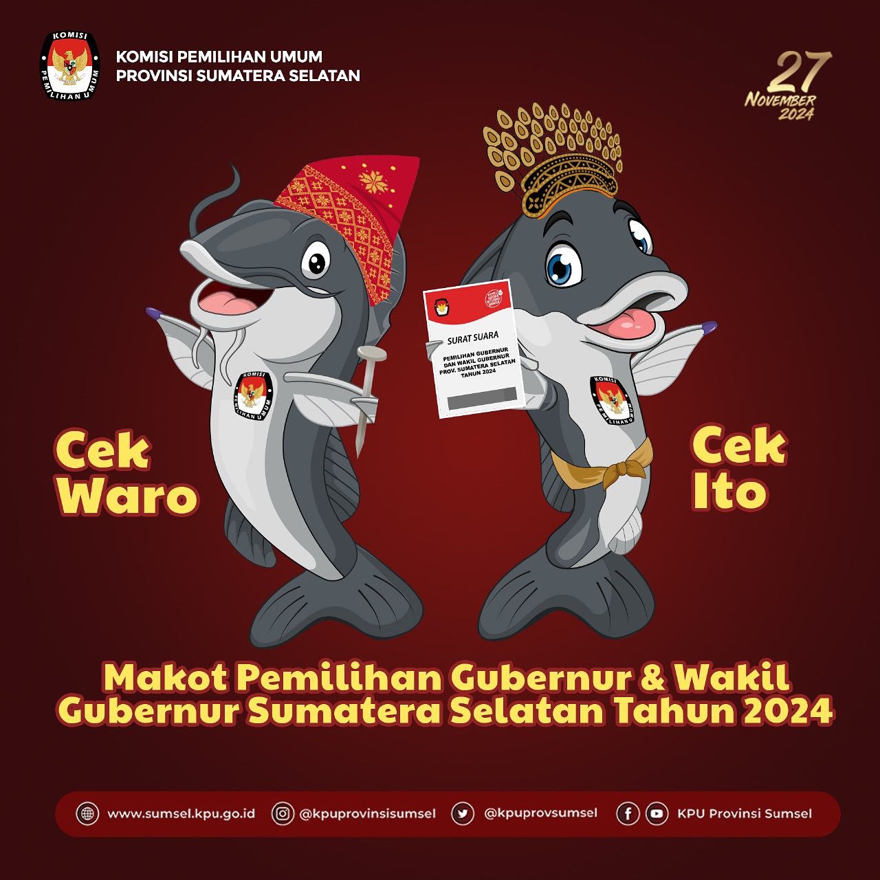 KPU Provinsi Sumatera Selatan dalam penyelenggaraan Peemilihan Gubernur dan Wakil Gubernur Provinsi Sumatera Selatan Tahun 2024, memilih maskot untuk Pemilihan Gubernur dan Wakil Gubernur Provinsi Sumatera Selatan Tahun 2024 berupa Ikon Ikan Baung yang diberi nama “Cek Waro” dan “Cek Ito”. Cek dalam Bahasa Palembang merupakan panggilan bentuk rasa hormat kepada orang yang memiliki selisih umur yang tak terlalu jauh, dan Kata “Cek” sudah menjadi lafal yang sering diucapkan panggilan sapaan keseharian masyarakat di Palembang. Sedangkan kata “Waro” dan “Ito” merupakan perpaduan bahasa Khas Sumatera Selatan yakni Suaro Kito (Waro-Ito). Dilanjutkan dengan perpaduan desain Ikan Baung merupakan desain yang terinspirasi dari Ikan Baung Sebagai identitas salah satu Primadona Fauna khas Sumatera Selatan.