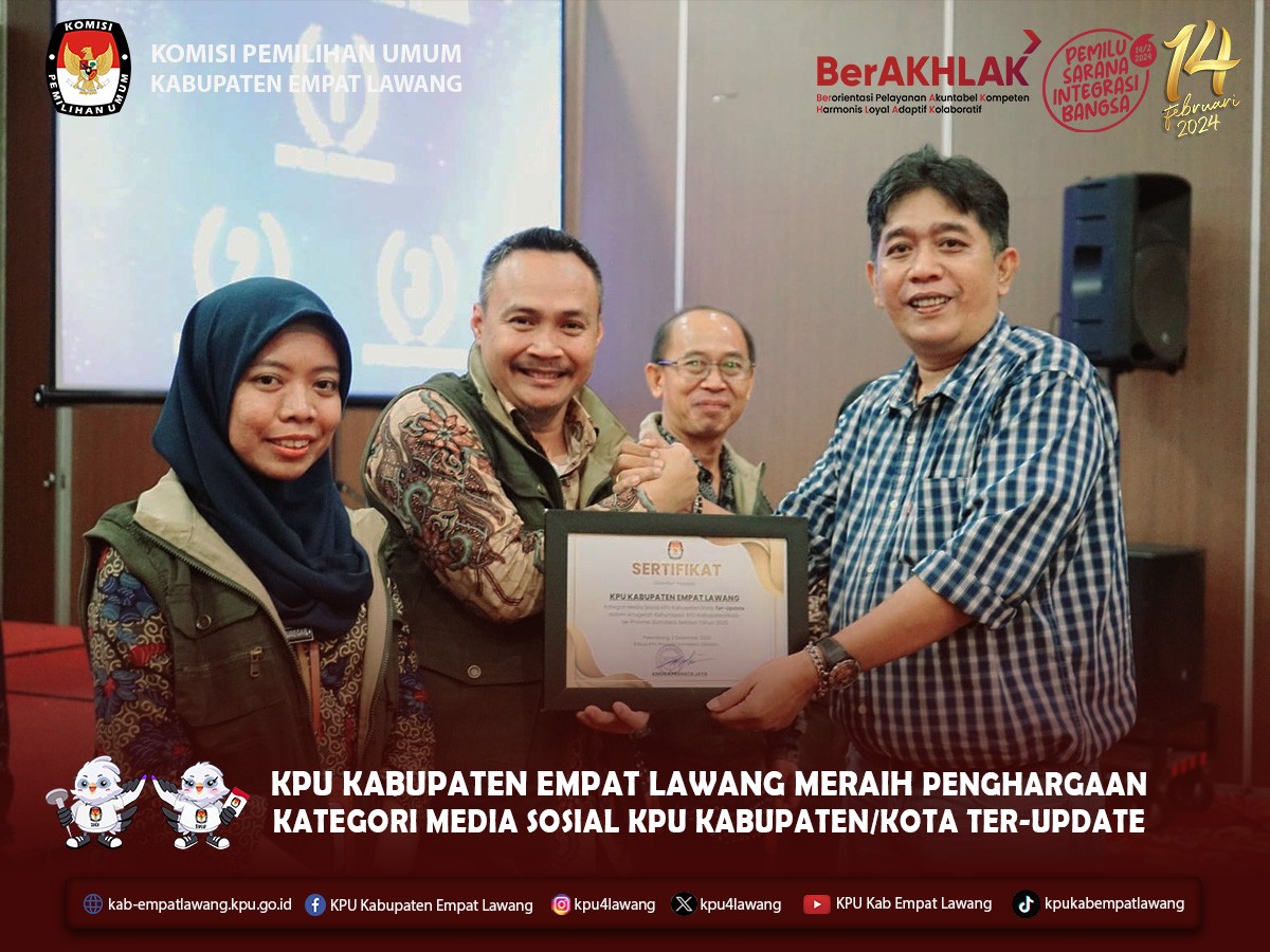 #TemanPemilih, KPU Kabupaten Empat Lawang mendapatkan penghargaan dari KPU Provinsi Sumatera Selatan dalam Anugrah Kehumasan KPU Kabupaten/Kota se-Provinsi Sumatera Selatan. Penghargaan diberikan untuk kategori Media Sosial KPU Kabupaten/Kota Ter-Update.
