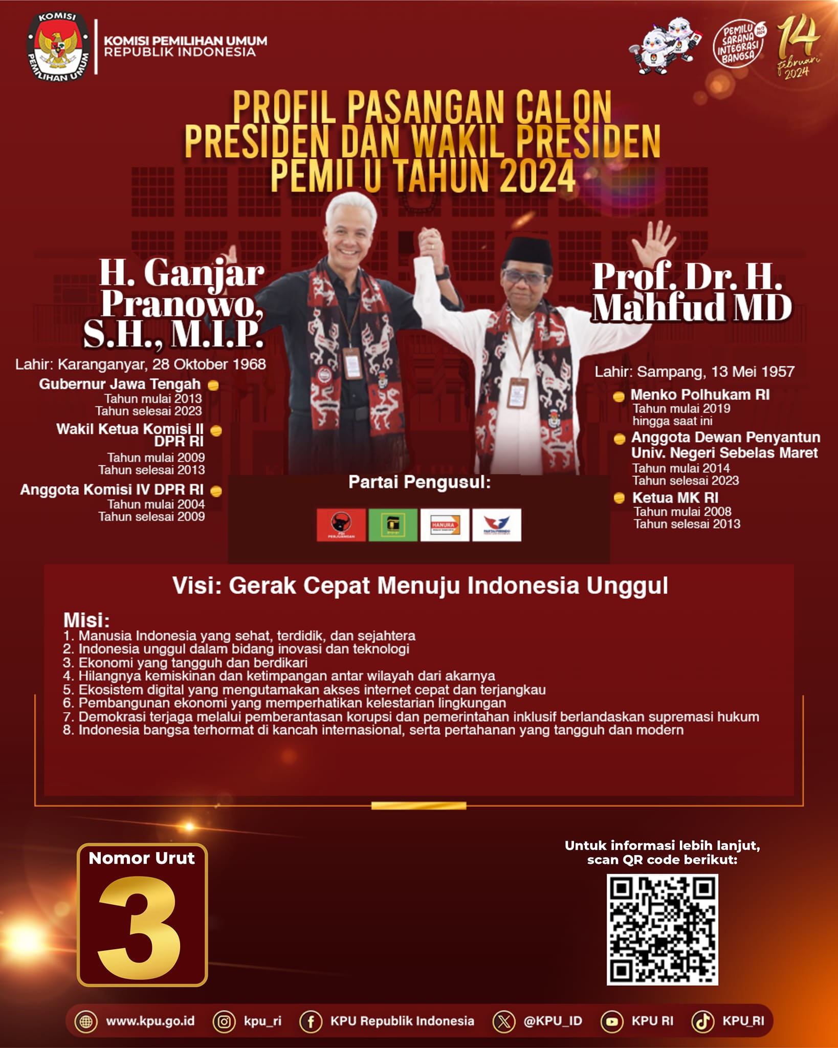 #TemanPemilih, kamu perlu tahu inilah Profil Pasangan Calon Presiden dan Wakil Presiden Pemilu Tahun 2024, H. Prabowo Subianto dan Gibran Rakabuming Raka yang diusulkan oleh Partai Gerindra, Partai Golkar, Partai Demokrat, PAN, PSI, PBB dan Partai Garuda
