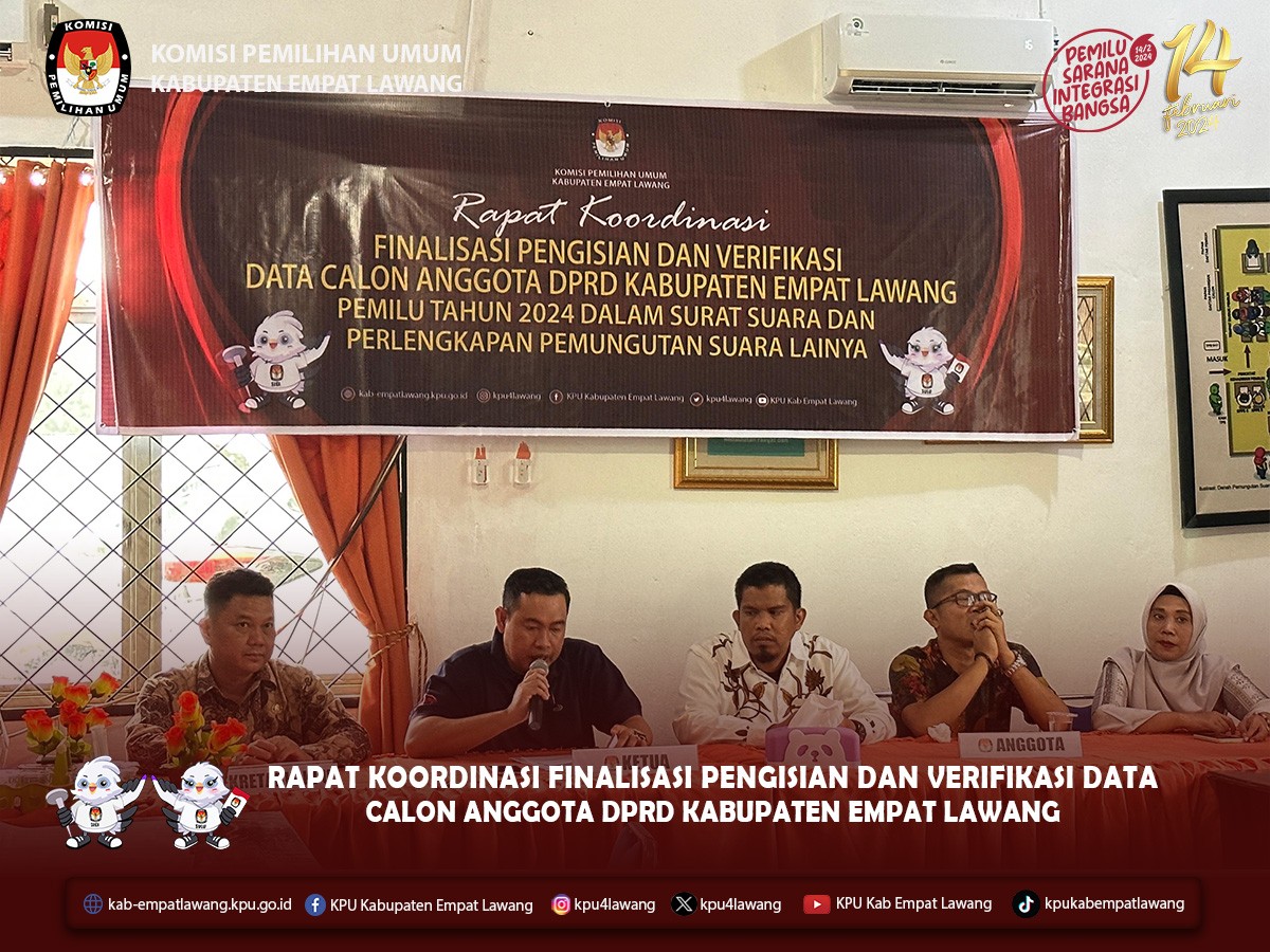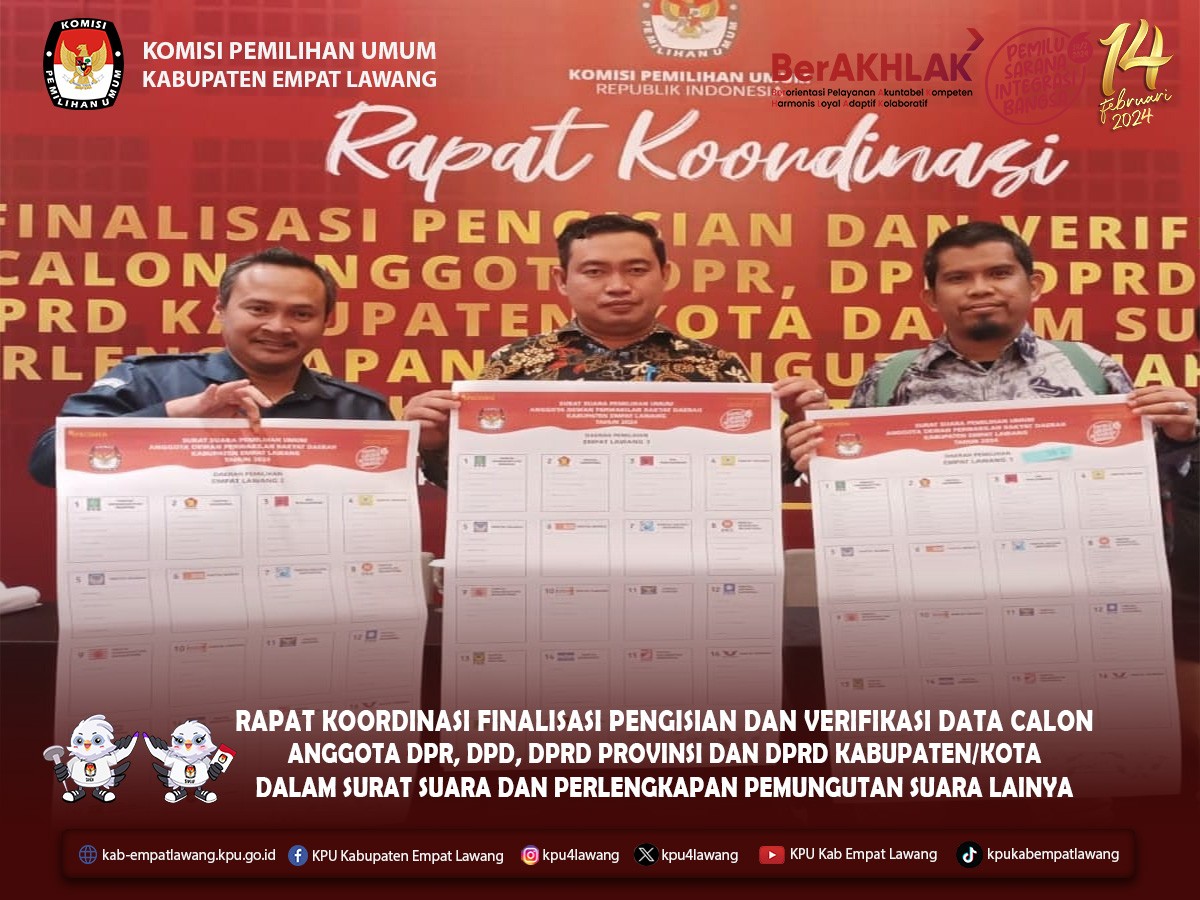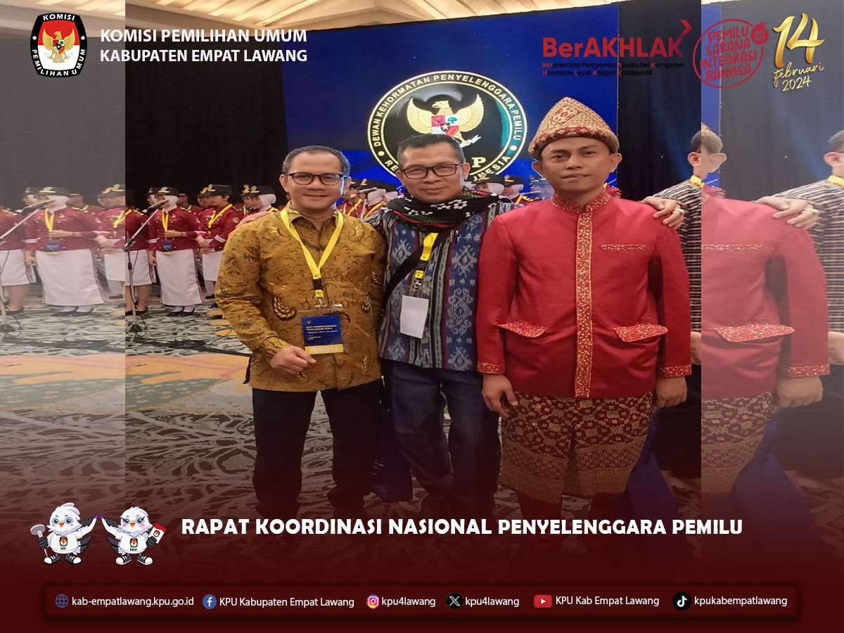 #TemanPemilih, Ketua KPU Kabupaten Empat Lawang Eskan Budiman, Anggota KPU Kab Empat Lawang Hendra Gunawan, dan Kasubbag Teknis Pemilu dan Hupmas Yance Martin menghadiri Rapat Koordinasi Finalisasi Pengisian dan Verifikasi Data Calon Anggota DPR, DPD, DPRD Provinsi dan DPRD Kabupaten/Kota dalam Surat Suara dan Perlengkapan Pemungutan Suara Lainya Pemilu Tahun 2024, bertempat di Hotel Grand Mercure Jakarta.