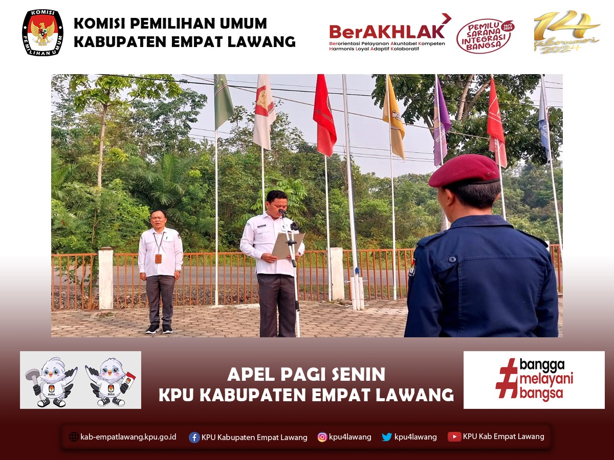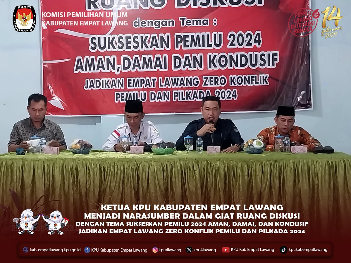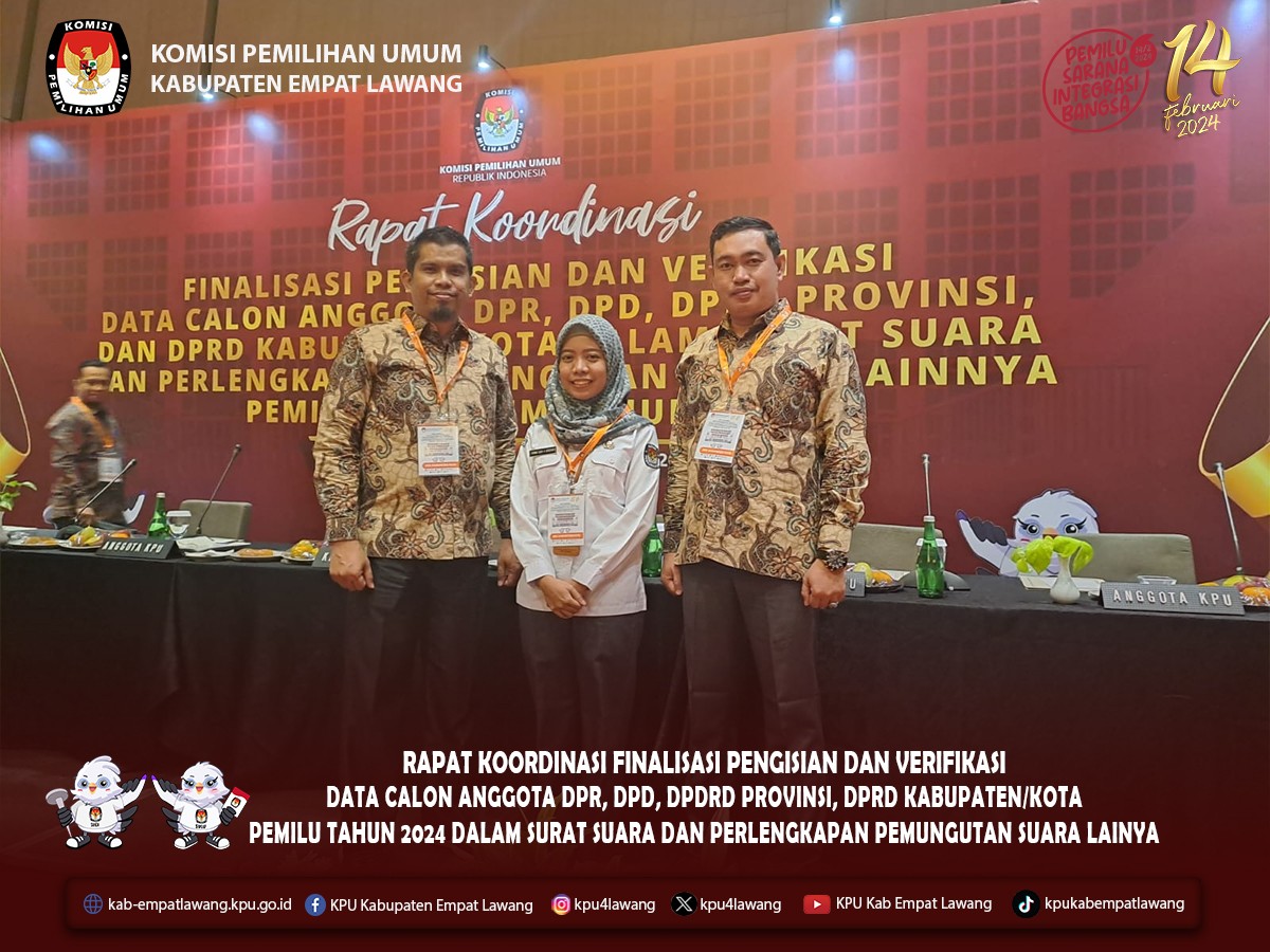 #TemanPemilih, KPU Kabupaten Empat Lawang menghadiri Rapat Koordinasi Finalisasi Pengisian dan Verifikasi Data Calon Anggota DPR, DPD, DPRD Provinsi, dan DPRD Kabupaten/Kota Pemilu Tahun 2024 dalam Suarat Suara dan Perlengkapan Pemungutan Suara Lainya. Dihadir oleh Ketua KPU Kabupaten Empat Lawang Eskan Budiman, Anggota Divisi Teknis Penyelenggaraan Hendra Gunawan dan Operator Silon, pada 30 Oktober -1 November 2023, bertempat di Hotel Grand Mercure Jakarta.