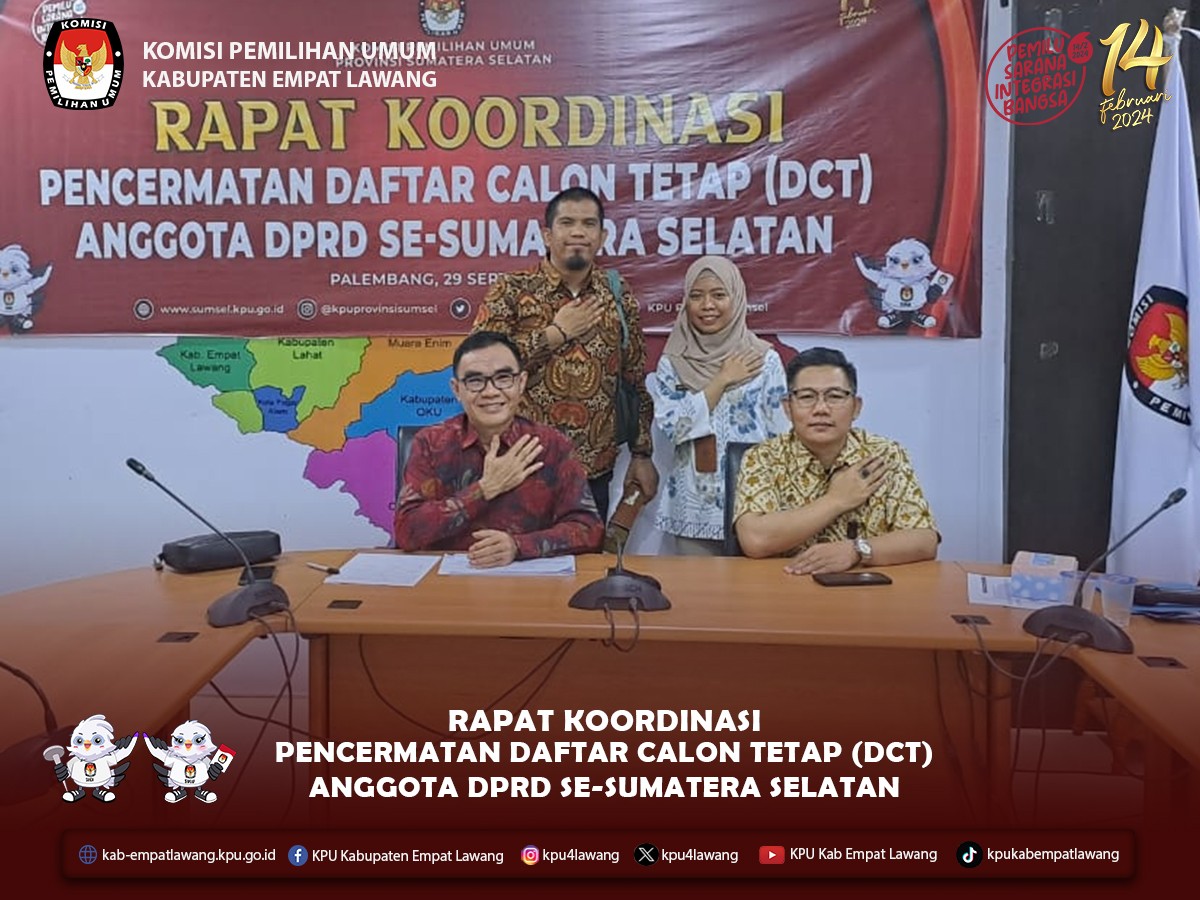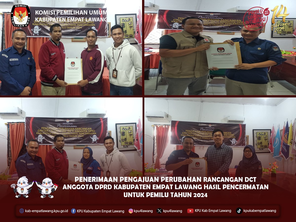 #TemanPemilih, KPU Kabupaten Empat Lawang telah menerima Pengajuan Perubahan Rancangan Daftar Calon Tetap Hasil Pencermatan untuk Pemilihan Umum Tahun 2024. Penerimaan dilakukan dari 24 September - 3 Oktober 2023, di Kantor KPU Kabupaten Empat Lawang. Sebanyak 14 Partai Politik yang telah mengajukan yaitu Partai PPP, Partai PKB, Partai Gelora Indonesia, Partai Demokrat, Partai Hanura, Partai PDIP, Partai Perindo, Partai Nasdem, Partai Golkar, Partai PKN, Partai PKS, Partai PSI, Partai Gerindra dan Partai PAN.