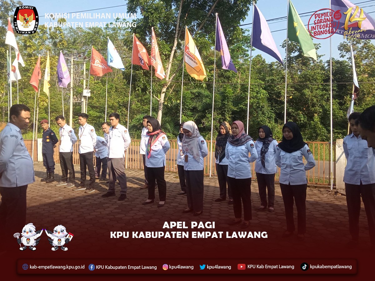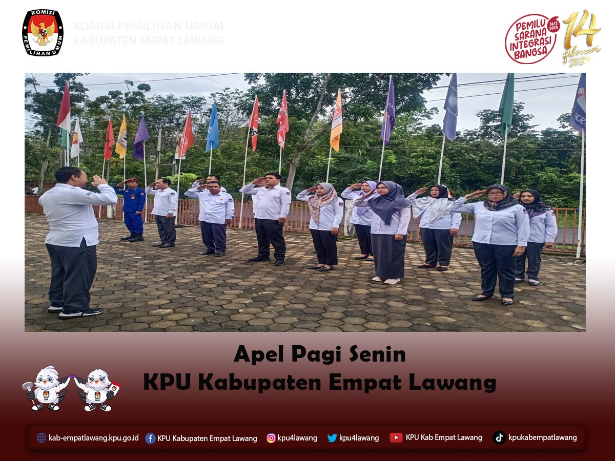 #TemanPemilih, Pelaksanaan Apel Senin Pagi KPU Kabupaten Empat Lawang, dipimpin oleh Kasubag Teknis Pemilu dan Hupmas KPU Kabupaten Empat Lawang (Yance Martin, SH) dan diikuti oleh para Kasubbag, Pejabat Fungsional, Staf Pelaksana dan PPNPN Sekretariat KPU Kabupaten Empat Lawang. Apel dilaksanakan pada pukul 08.00 WIB s.d selesai.