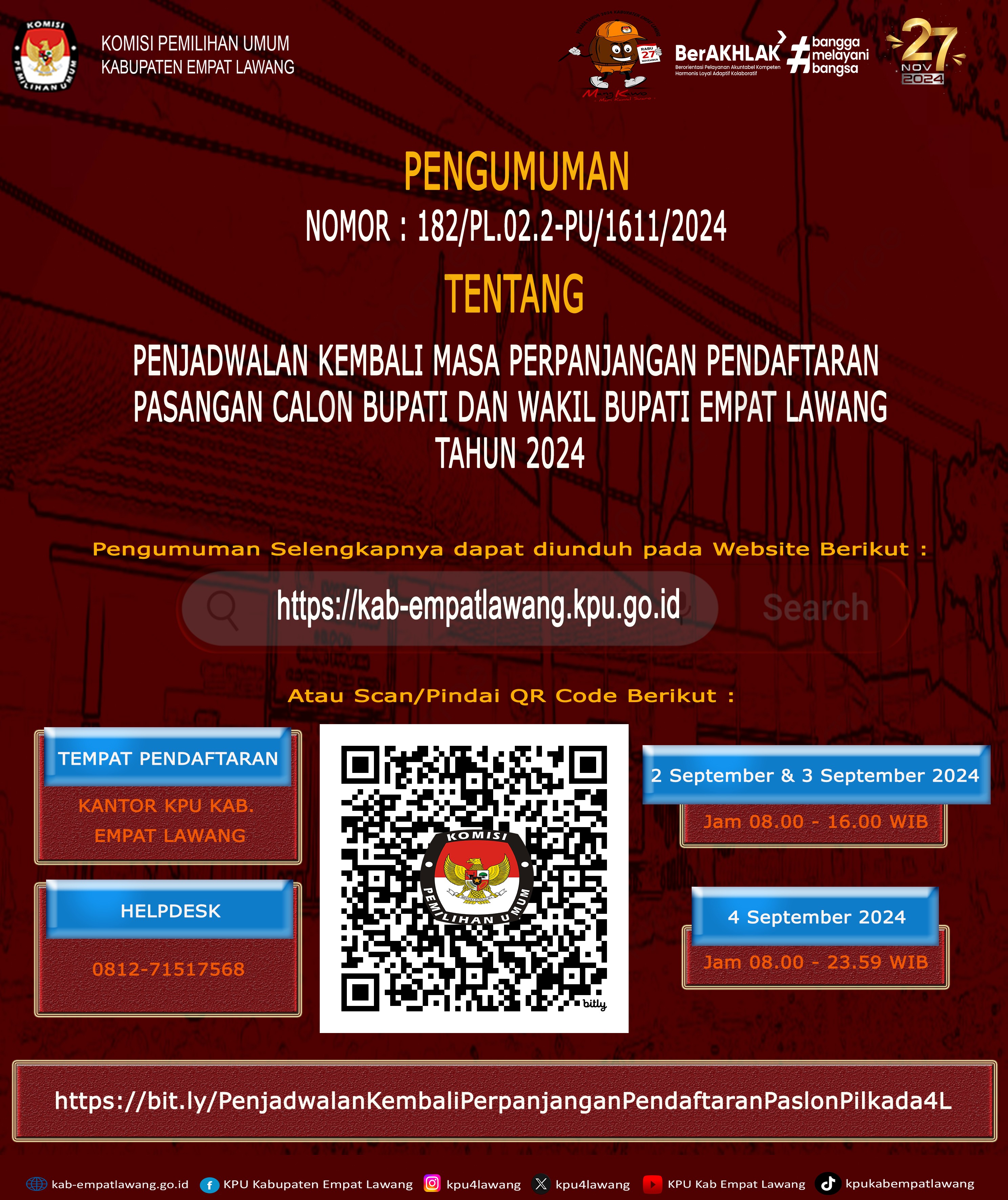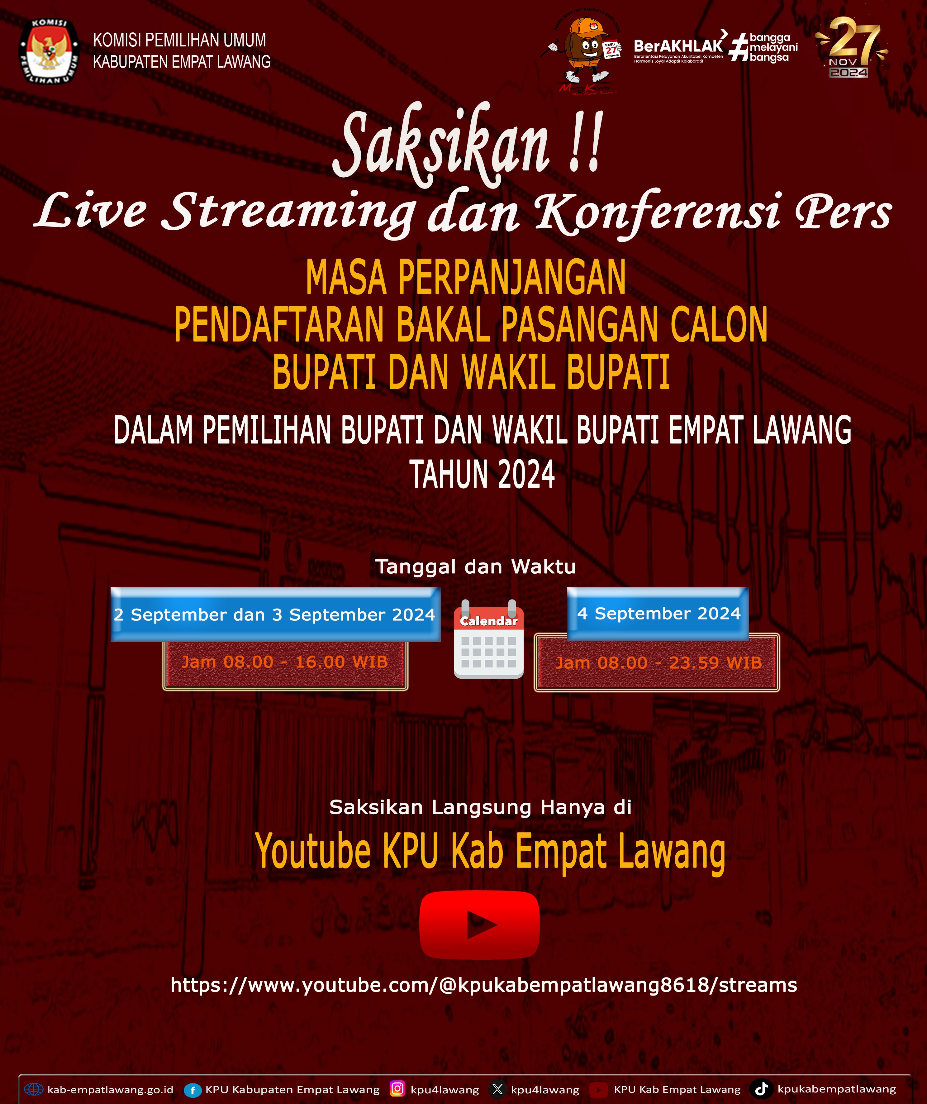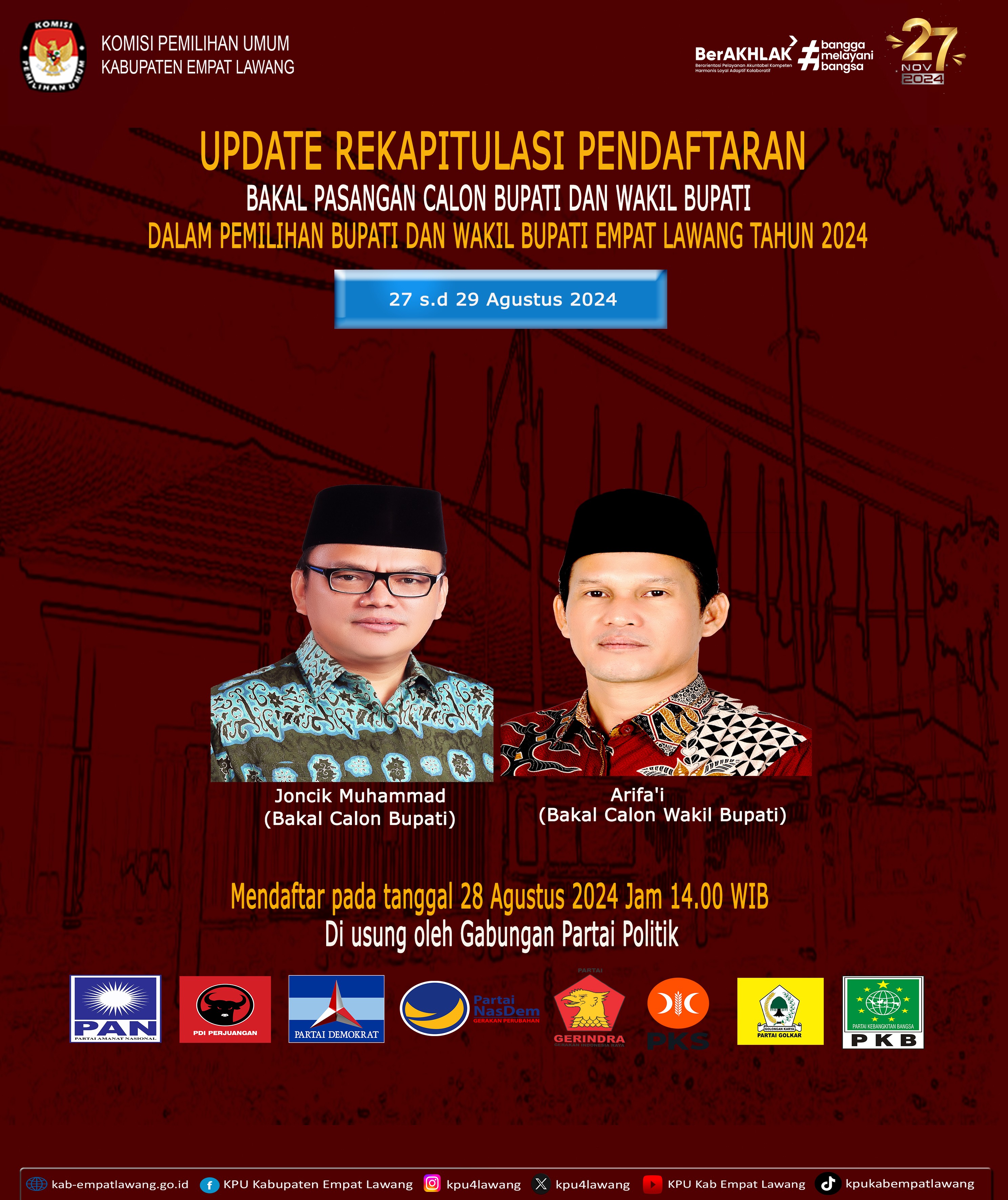 #TemanPemilih, Berikut Update Rekapitulasi Pendaftaran Bakal Pasangan Calon Bupati dan Wakil Bupati Dalam Pemilihan Bupati dan Wakil Bupati Empat Lawang Tahun 2024 dari Tanggal 27 s.d 29 Agustus 2024.