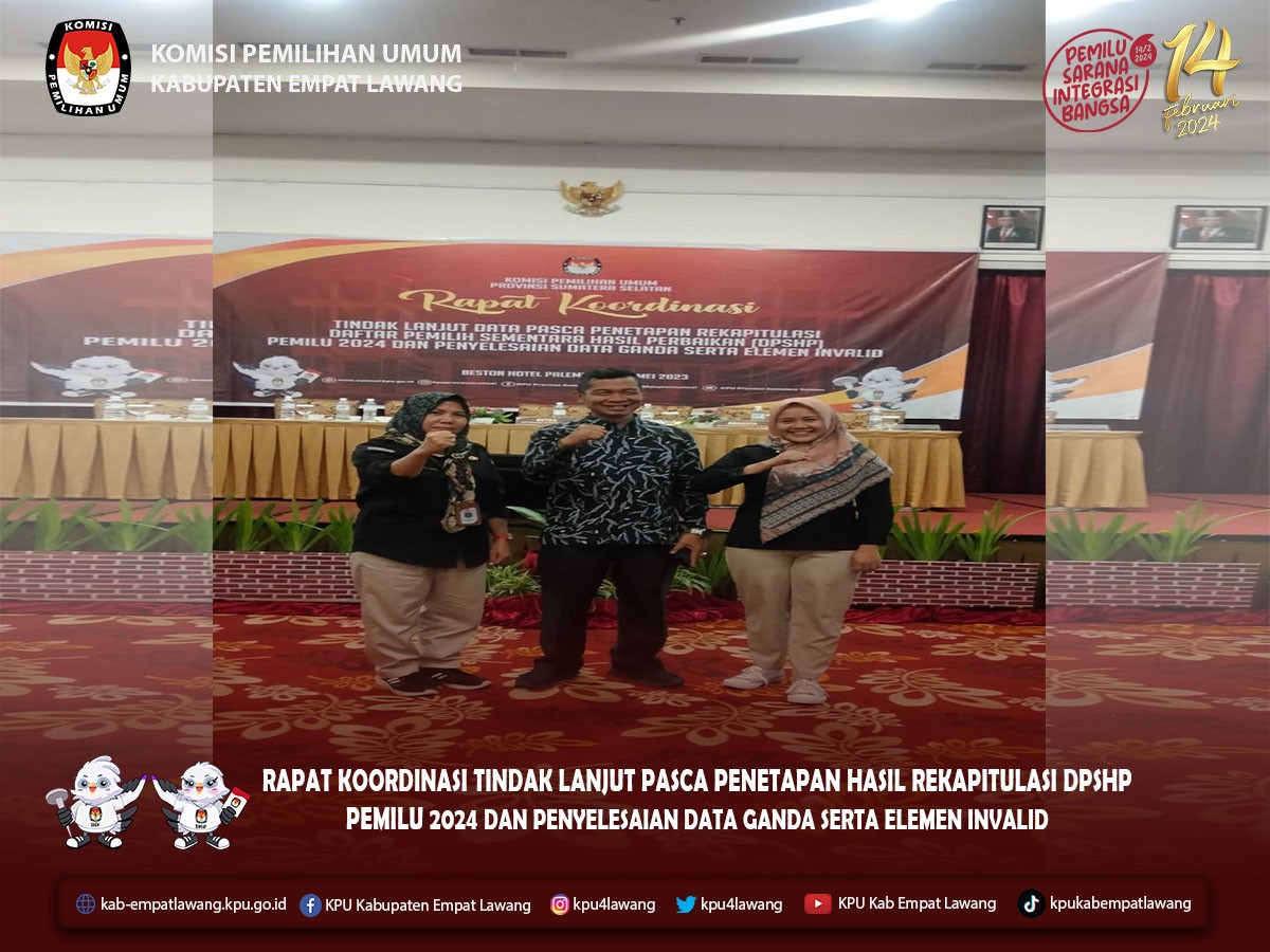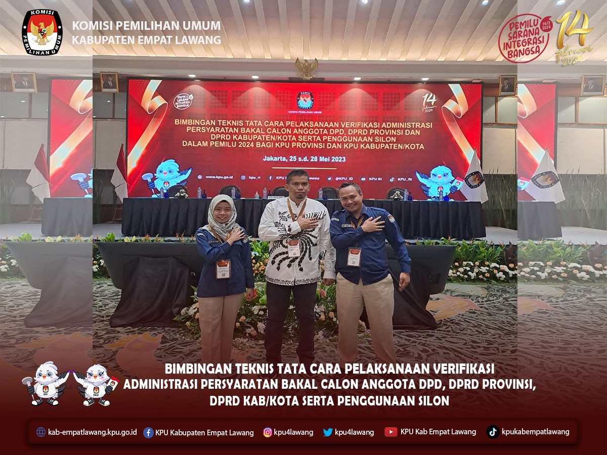 #TemanPemilih, Anggota KPU Kabupaten Empat Lawang Hendra Gunawan, Kasubbag Teknis Pemilu dan Hupmas Yance Martin, serta operator Silon mengikuti Bimbingan Teknis Tata Cara Verifikasi Administrasi Persyaratan Bakal Calon Anggota DPD, DPR, DPRD Provinsi, DPRD Kab/Kota serta Penggunaan Silon dalam Pemilihan Umum Tahun 2024. Bertempat di Hotel Grand Sahid Jaya Jakarta, kegiatan diikuti dari 25 - 28 Mei 2023.
