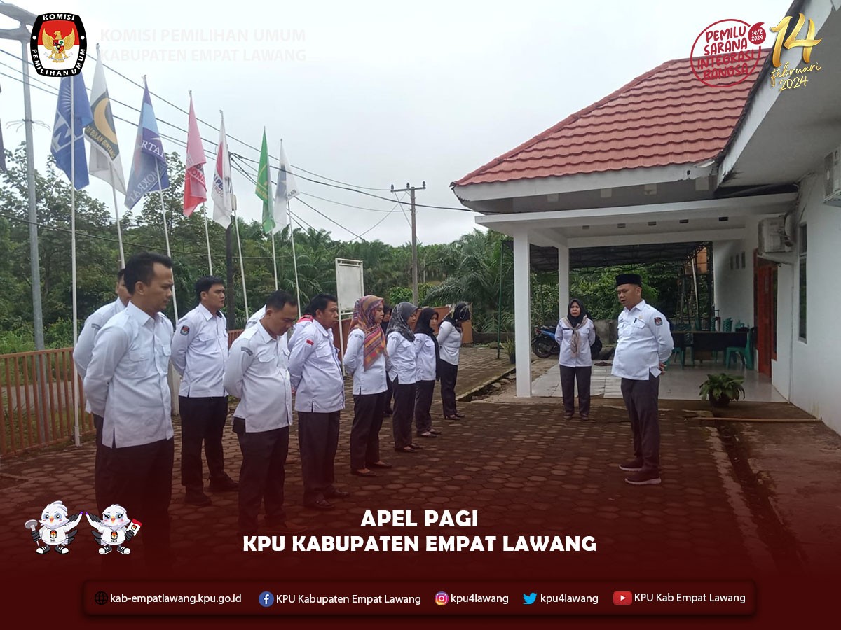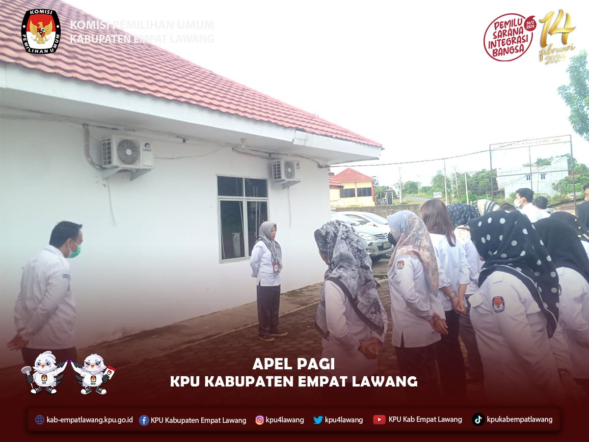 #TemanPemilih, Pelaksanaan Apel Pagi KPU Kabupaten Empat Lawang dipimpin oleh Kasubbag Keuangan, Umum, dan Logistik Rosmeliyanti, dan diikuti oleh Kasubbag, Pejabat Fungsional, Staf Pelaksana dan PPNPN Sekretariat KPU Kabupaten Empat Lawang. Apel dilaksanakan pada pukul 08.00 WIB s.d selesai.