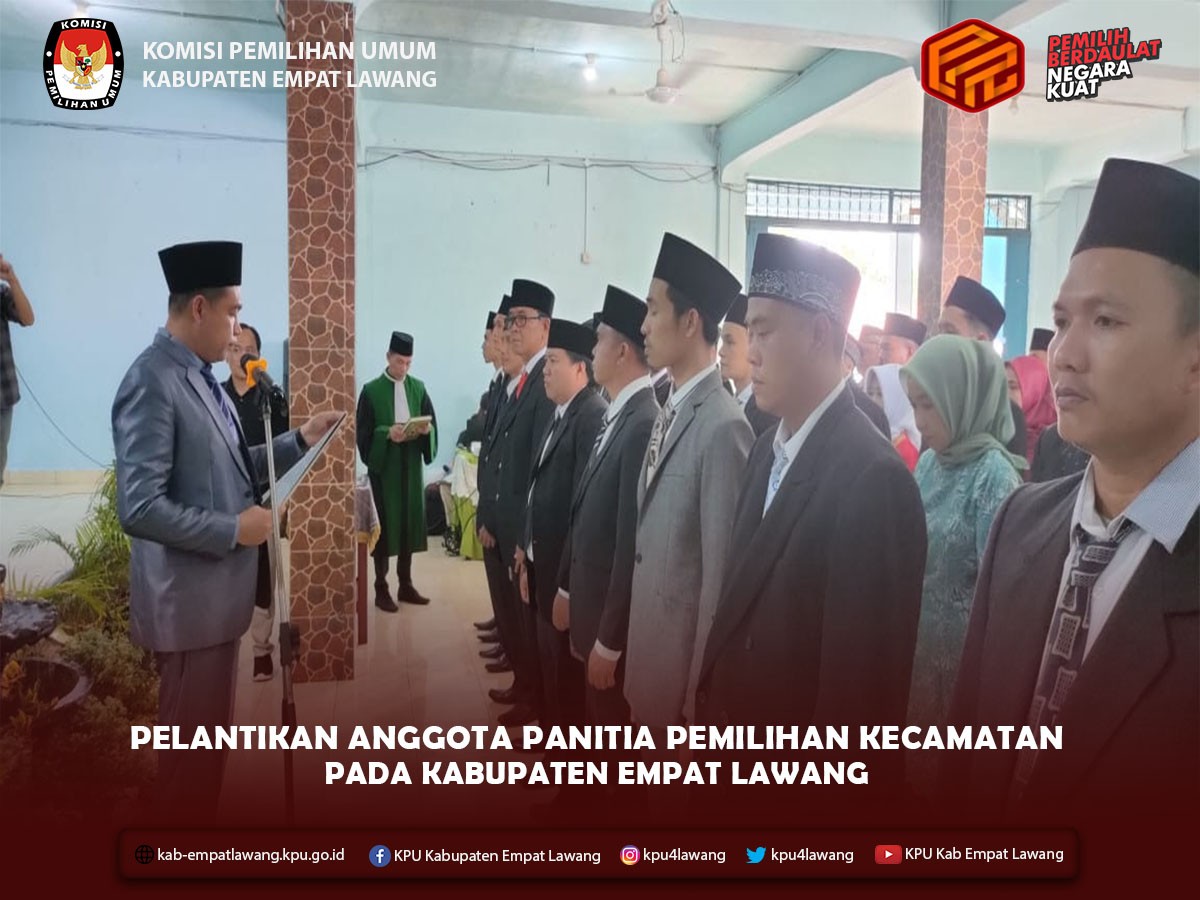 Bertempat di Hotel Kito Tebing Tinggi pada 4/1/23, sebanyak 50 anggota PPK dari 10 Kecamatan di Kab Empat Lawang dilantik oleh Ketua KPU Kab Empat Lawang Eskan Budiman. Pelantikan dihadiri oleh Anggota KPU Kab Empat Lawang, Sekretaris KPU Kab Empat Lawang, Asiseten I Bidang Pemerintahan dan Kesra Kab Empat Lawang, Bawaslu Kab Empat Lawang, Kepala Badan Kesbangpol Kab Empat Lawang, Polres Empat Lawang, Dandim 0405 Lahat, dan Camat di Kab Empat Lawang.