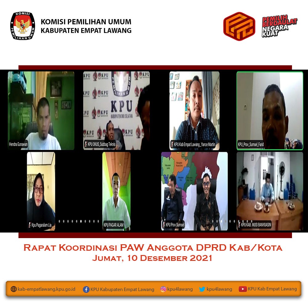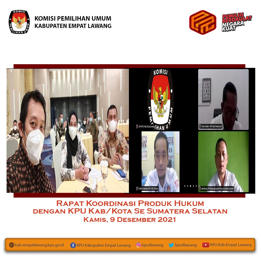 #TemanPemilih, KPU Kabupaten Empat Lawang mengikuti Rapat Koordinasi Produk Hukum dengan KPU Kab/Kota Se Sumatera Selatan. Rapat diikuti oleh Anggota KPU Kab Empat Lawang Debi Yosiana, S.E. secara luring di Hotel Alts Palembang dan diikuti oleh Sub Koordinator Hukum dan SDM (Sulaimanto Wibowo, S.H.) beserta staf secara daring melalui zoom meeting mulai pukul 08.00 WIB s.d Selesai.