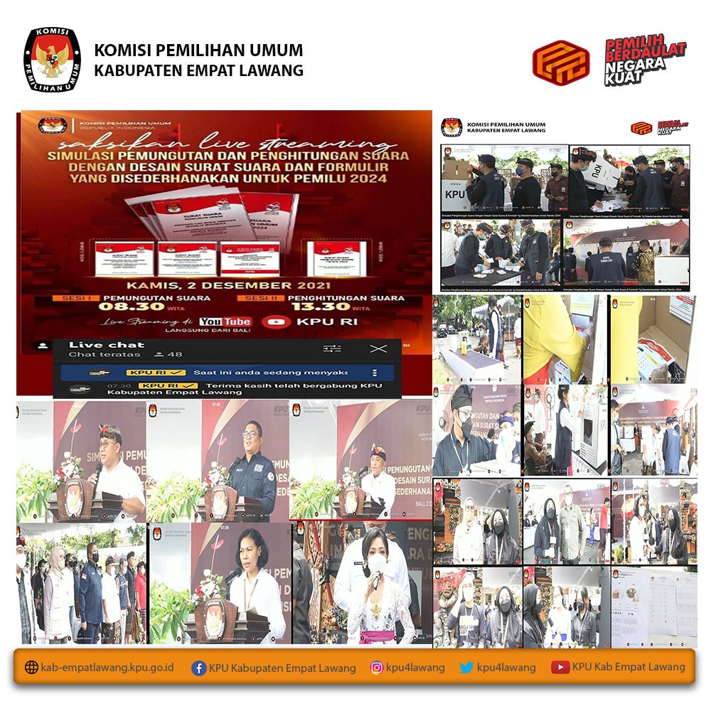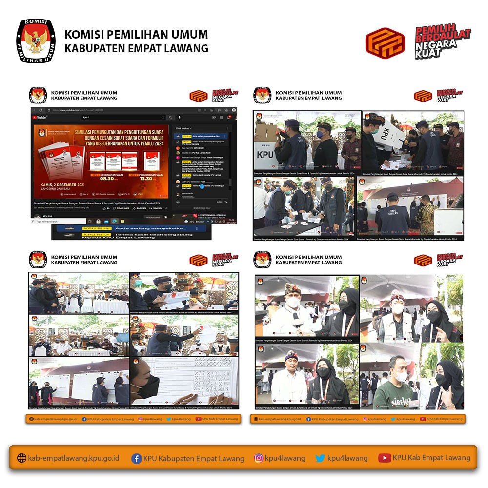 Kamis, 2 Desember 2021 #TemanPemilih, KPU Kabupaten Empat Lawang mengikuti Live Streaming Simulasi Pemungutan Suara dengan Desain Surat Suara Yang Disederhanakan Untuk Pemilu 2024 ke II di Provinsi Bali melalui Kanal YouTube KPU RI mulai pukul 08.30 WITA (07.30 WIB) s.d selesai. Acara di Buka Oleh Anggota KPU RI Arief Budiman. Turut Hadir Anggota KPU RI yang lainnya (Evi Novida Ginting Manik, I Dewa Kade Wiarsa Raka Sandi, Pramono Ubaid Thantowi, Hasyim Asy'ari dan Viryan) dan Jajaran Sekretariat Jenderal KPU RI, Ketua dan Anggota KPU Provinsi Bali dan Jajaran Sekretariat serta KPU Kabupaten/Kota se Bali, Bawaslu RI dan Bawaslu Provinsi Bali, Gubernur Provinsi Bali, KPU Provinsi di Luar Bali, Bapak Hadar Nafis Gumay (Pegiat Pemilu), Partai Politik, Media dan LSM dan Masyarakat lainnya. Sebagaimana di jelaskan oleh Kepala Biro Teknis Penyelenggaran Pemilu KPU RI (Melgia Carolina Van Harling) dalam Simulasi Pemungutan Suara dengan Desain Surat Suara Yang Disederhanakan Untuk Pemilu 2024 ke II di Provinsi Bali ini melanjutkan Simulasi yang ke I di Provinsi Sulawesi Utara, namun berbeda yang dicoba 100 Pemilih untuk menggunakan Hak Pilihnya di 2 TPS dengan Jenis Surat Suara yang berbeda. TPS 1 memuat 3 Surat Suara Pemilihan untuk Peserta Pemilu dimana 1 Surat Suara untuk Pemilihan Presiden dan Wakil Presiden dan DPR RI, 1 Surat Suara untuk Pemilihan DPD RI dan 1 Surat Suara untuk Pemilihan DPRD Provinsi dan DPRD Kabupaten Kota. TPS 2 memuat hanya 1 Surat Suara Pemilihan Peserta Pemilu untuk 5 Pemilihan sekaligus yaitu Pemilihan Presiden dan Wakil Presiden, DPR RI, DPD RI, DPRD Provinsi dan DPRD Kabupaten Kota. Sama seperti Simulasi sebelumnya, tujuannya untuk mengevaluasi efisiensi waktu, kemudahan dan ketepatan pemilih dan mempermudah beban KPPS. Acara ini dilakukan dengan tetap menjaga dan menerapkan Protokol Kesehatan Pencegahan covid-19. #KPUMelayani