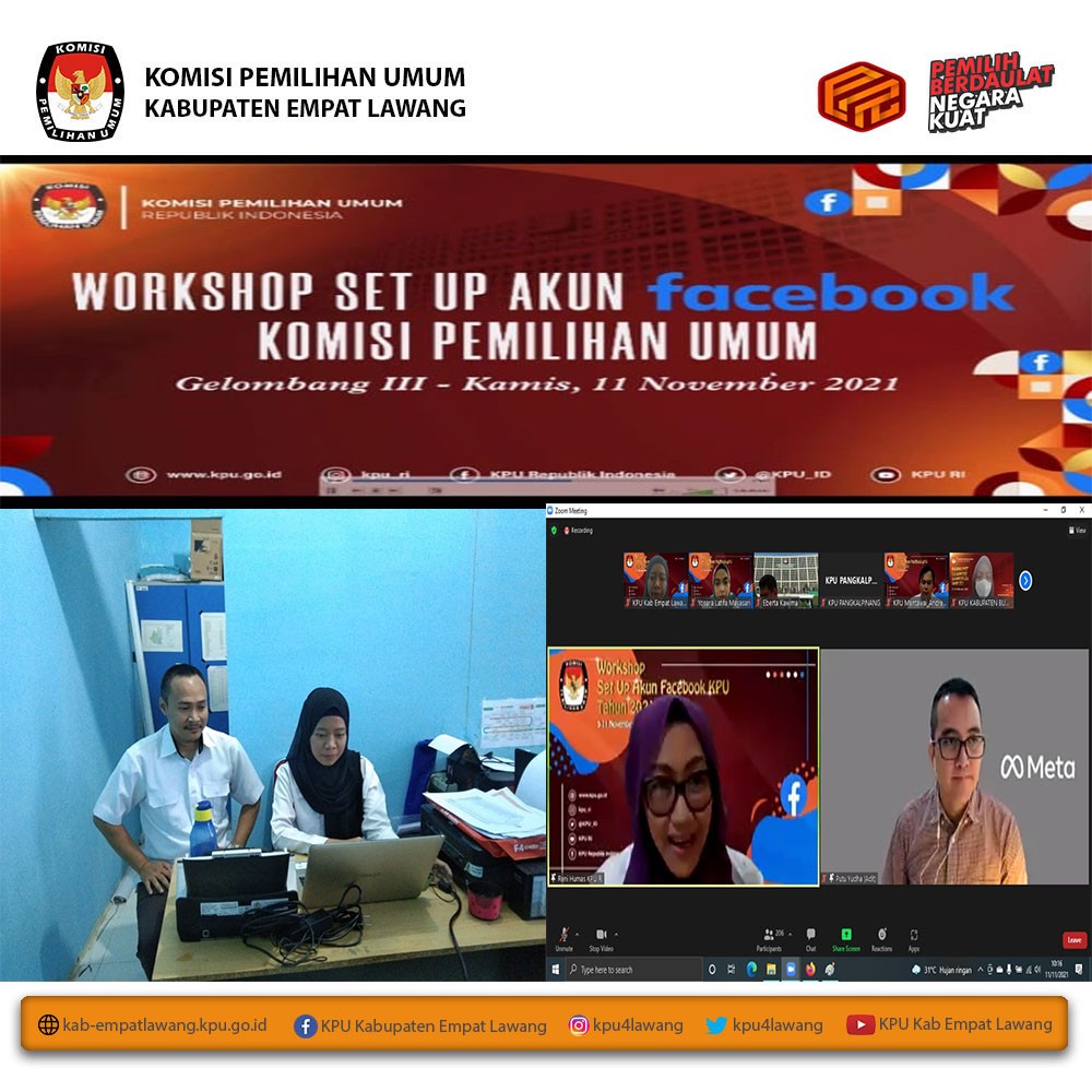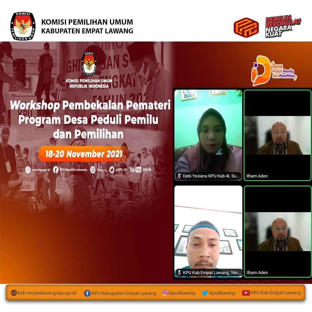 #TemanPemilih, KPU Kabupaten Empat Lawang mengikuti Workshop Pembekalan Pemateri Desa Peduli Pemilu dan Pemilihan yang diselenggarakan KPU RI. Workshop diikuti oleh Anggota KPU Kab Empat Lawang Divisi Sosialisasi, Pendidikan Pemilih, Parmas dan SDM (Debi Yosiana, SE) dan Sub Koordinator Teknis Pemilu dan Hupmas (Yance Martin, SH) melalui aplikasi zoom meeting mulai pukul 13.00 WIB s.d selesai.
