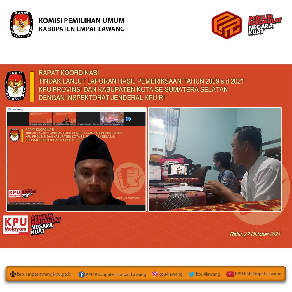 Pejabat Pembuat Komitmen (PPK), Bendahara Peneriamaan serta Staf Keuangan KPU Kabupaten Empat Lawang mengikuti Rapat Koordinasi Tindak Lanjut Laporan Hasil Pemeriksaan Tahun 2009 s.d 2021. Rapat diikuti KPU Prov, Kab/Kota SeSumatera Selatan dengan Inspektorat Jenderal KPU RI, secara daring melalui aplikasi zoom meeting.