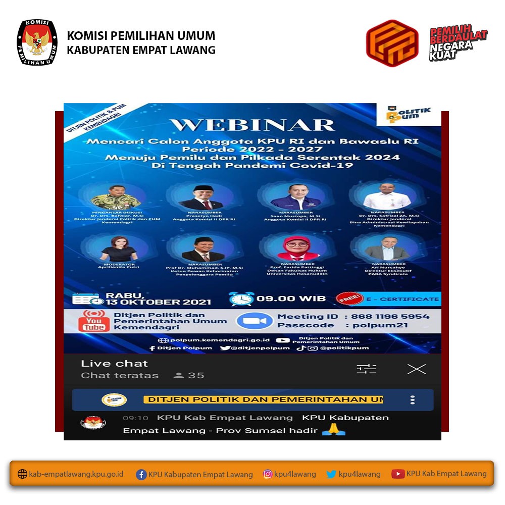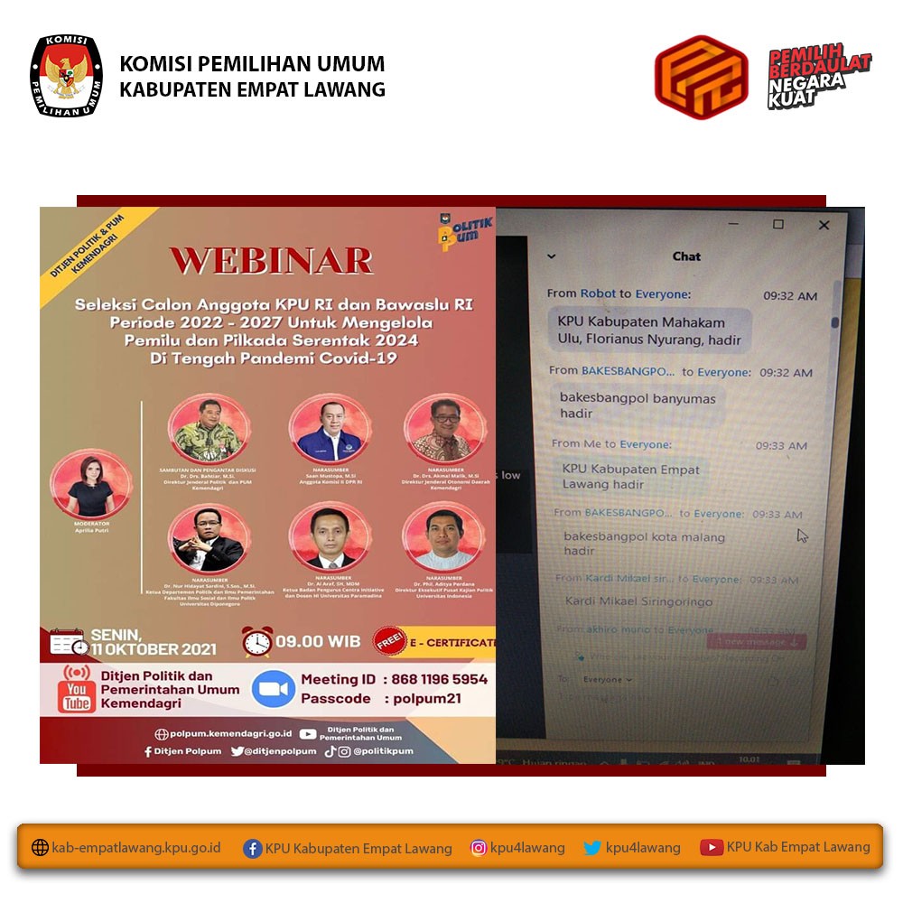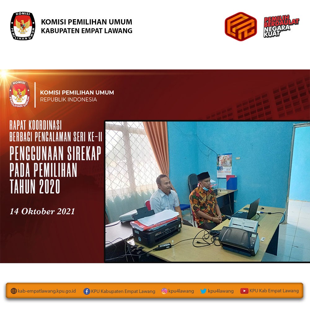 KPU Kabupaten Empat Lawang mengikuti Rapat Koordinasi Berbagi Pengalaman Seri II Penggunaan Sirekap Pada Pemilihan Tahun 2020 yang diselenggarakan KPU RI. Rapat diikuti oleh Anggota KPU Kab Empat Lawang Divisi Teknis Penyelenggaraan (Hendra Gunawan, S.HI, M.Ag) dan Sub Koordinator Teknis Pemilu dan Hupmas (Yance Martin, SH) melalui zoom meeting.