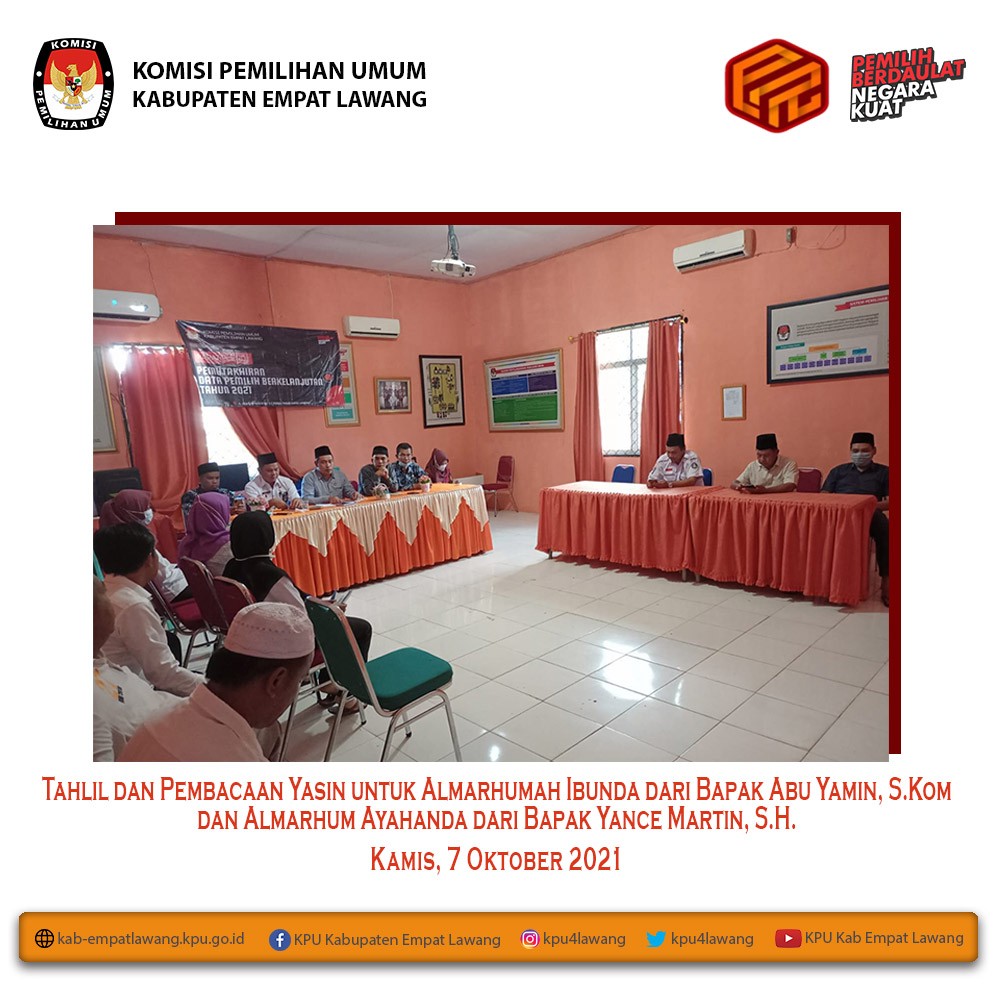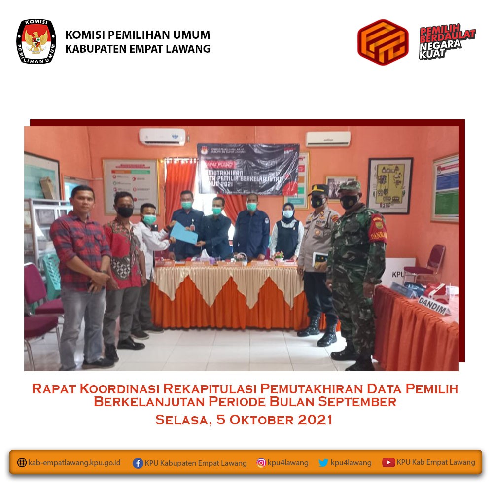 KPU Kabupaten Empat Lawang mengadakan Rapat Koordinasi Rekapitulasi Pemutakhiran Data Pemilih Berkelanjutan Periode Bulan September 2021. Rapat yang dilaksanakan pada Selasa 5 Oktober 2021 dihadiri juga oleh Bawaslu Kab Empat Lawang, Dandim 0405 Lahat, Polres Empat Lawang, Didukcapil Kab Empat Lawang, dan Kesbangpol Empat Lawang, dimulai pukul 10.00 WIB s.d selesai.