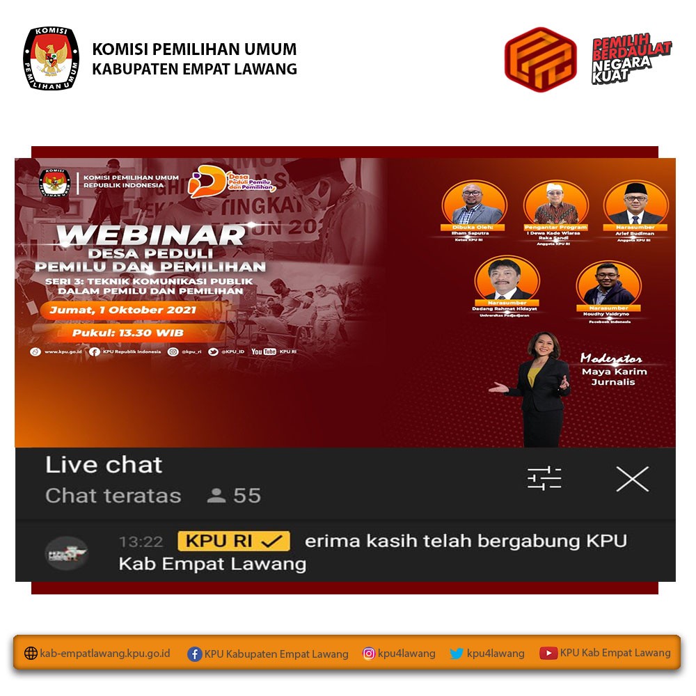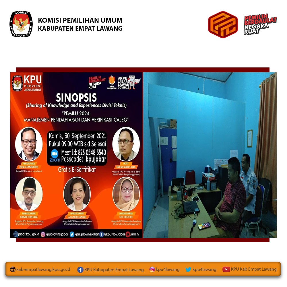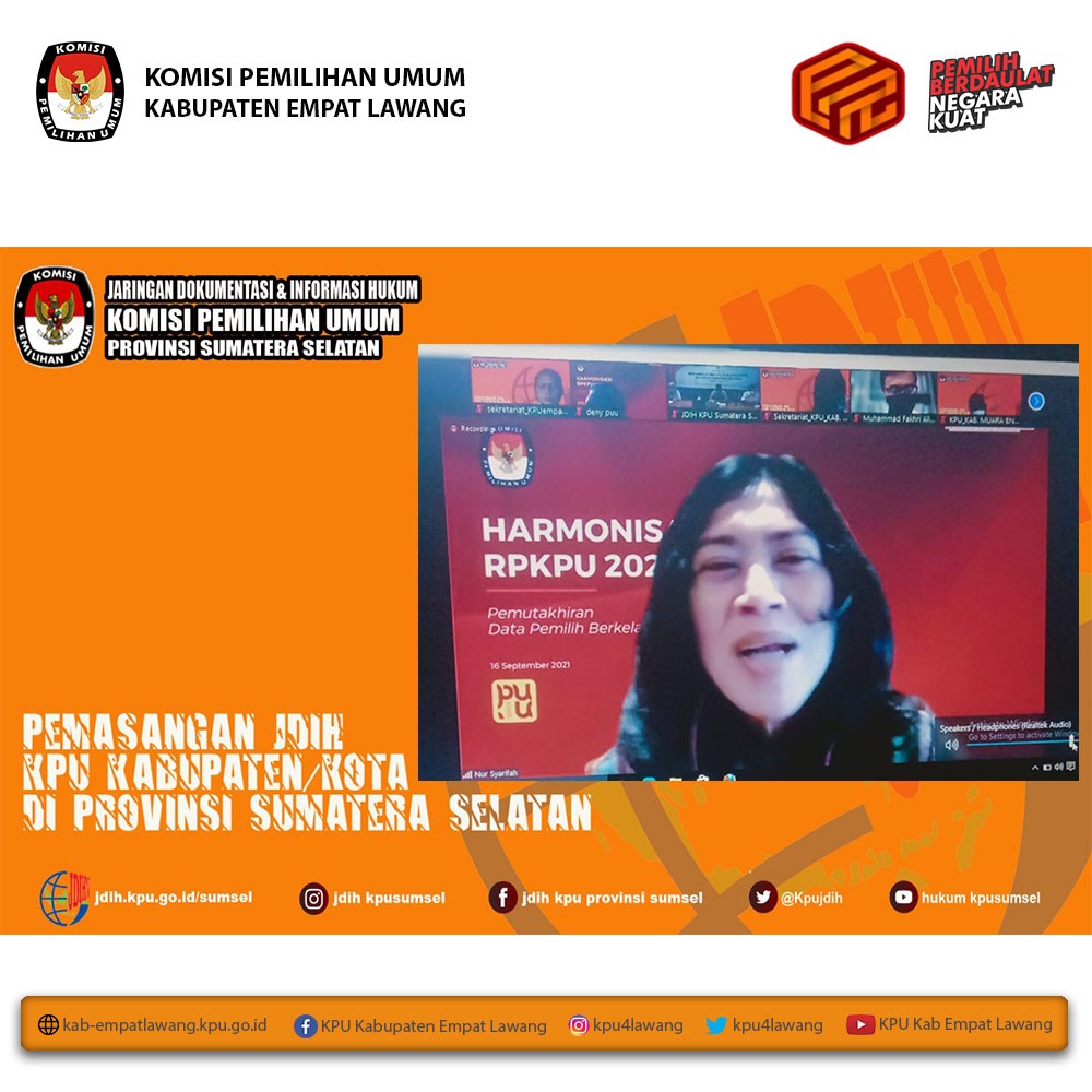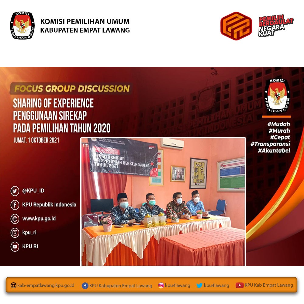 KPU Kabupaten Empat Lawang mengikuti Focus Group Discussion (FGD) Sharing of Experience Penggunaan Sirekap pada Pemilihan Tahun 2020. Kegiatan diikuti oleh Ketua KPU Kab Empat Lawang (Eskan Budiman, S.Pd) Anggota KPU Kab Empat Lawang (Hendra Gunawan, S.HI, M.Ag) dan (Abu Yamin, S.Kom) serta Sub Koordinator Teknis Pemilu dan Hupmas (Yance Martin, SH) melalui aplikasi zoom meeting, mulai pukul 09.00 WIB s.d selesai.