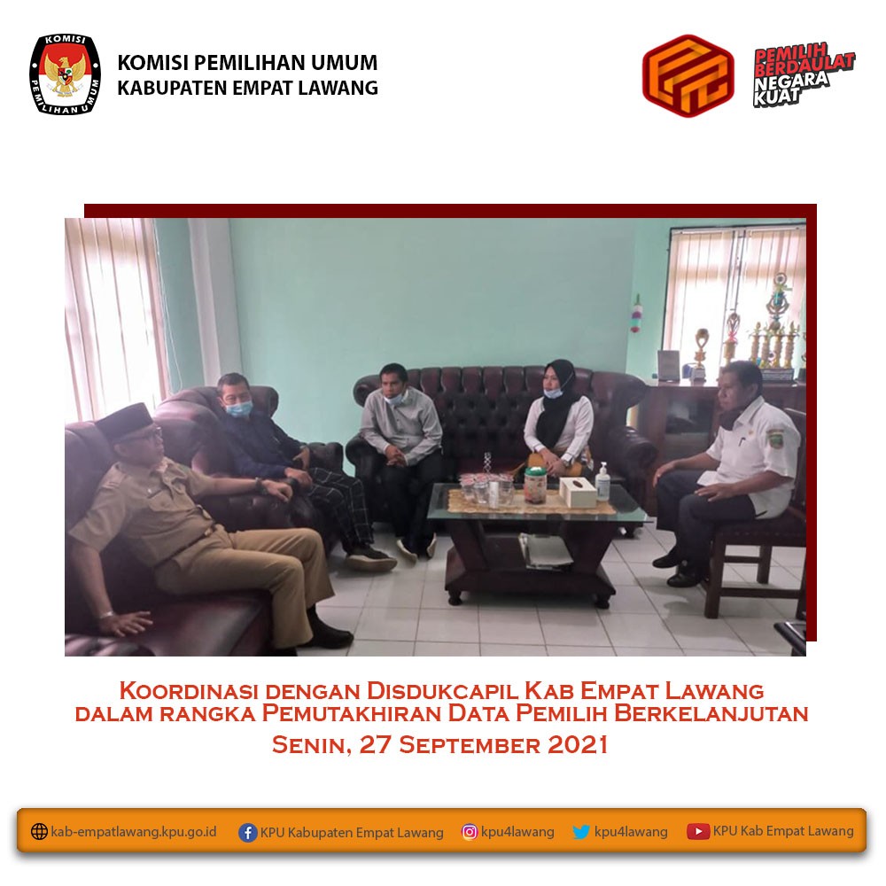 Anggota KPU Kab Empat Lawang Divisi Perencanaan, Data dan Informasi Abu Yamin, S.Kom., dan Anggota KPU Kab Empat Lawang Divisi Teknis Penyelenggaraan Hendra Gunawan, S.HI., M.Ag. didampingi Sub Koordinator Perencanaan, Data dan Informasi Iis Sugianti, S.TP. serta staf melakukan Koordinasi dengan Dinas Kependudukan dan Catatan Sipil Kabupaten Empat Lawang dalam rangka Pemutakhiran Data Pemilih Berkelanjutan.