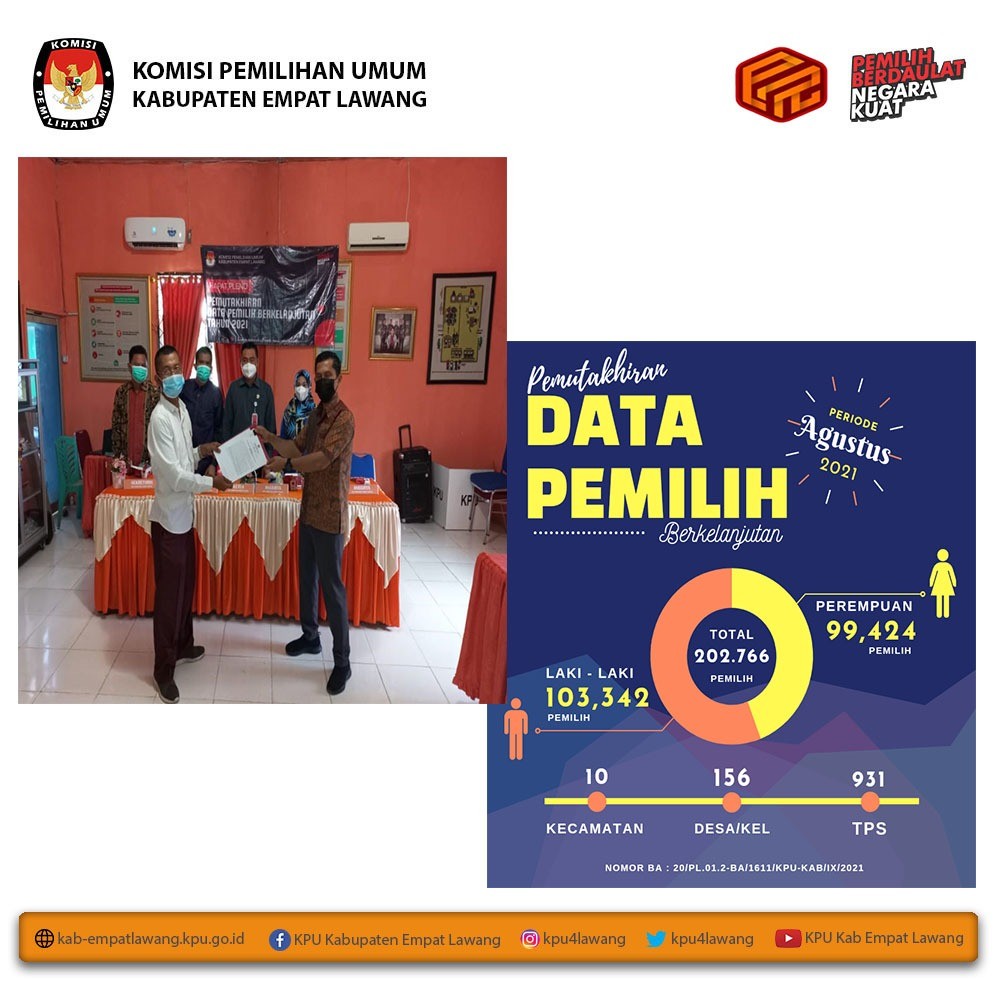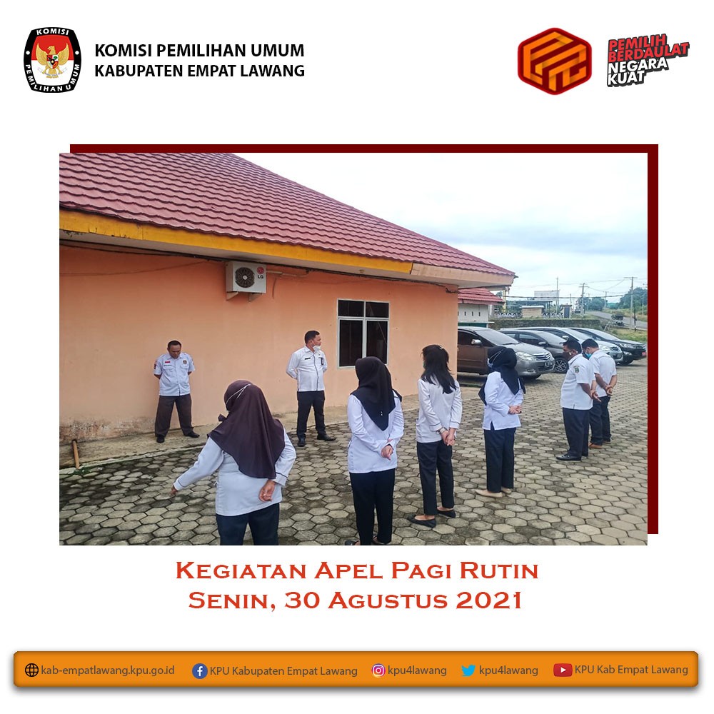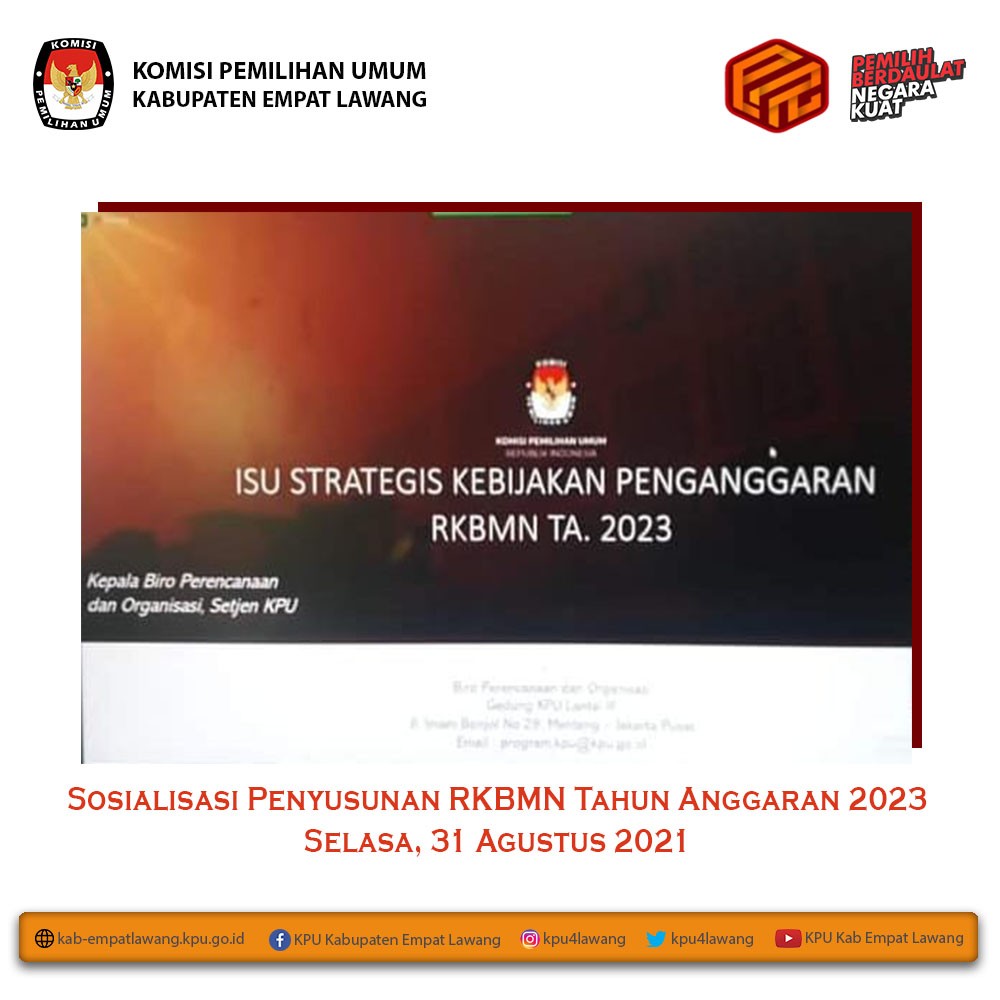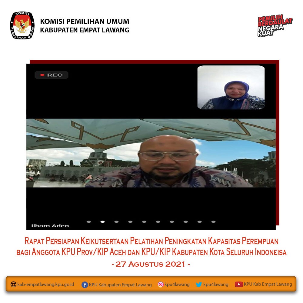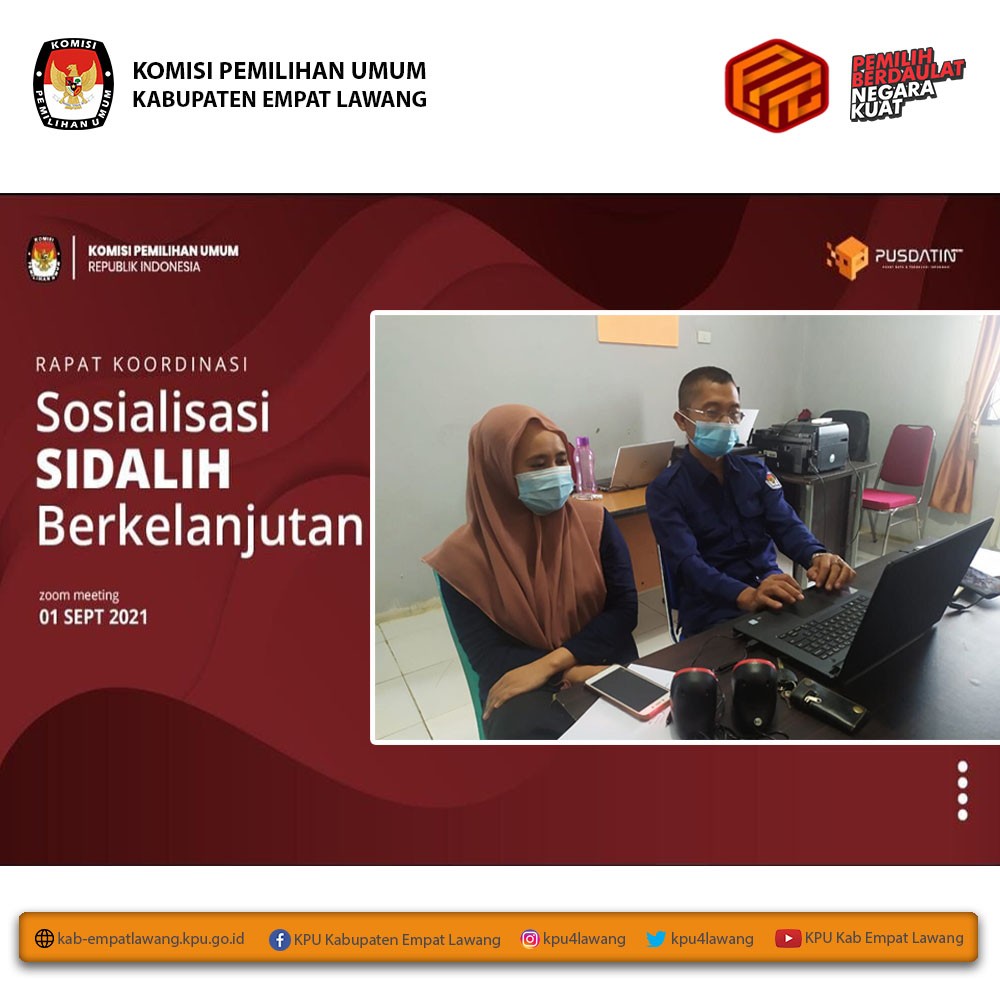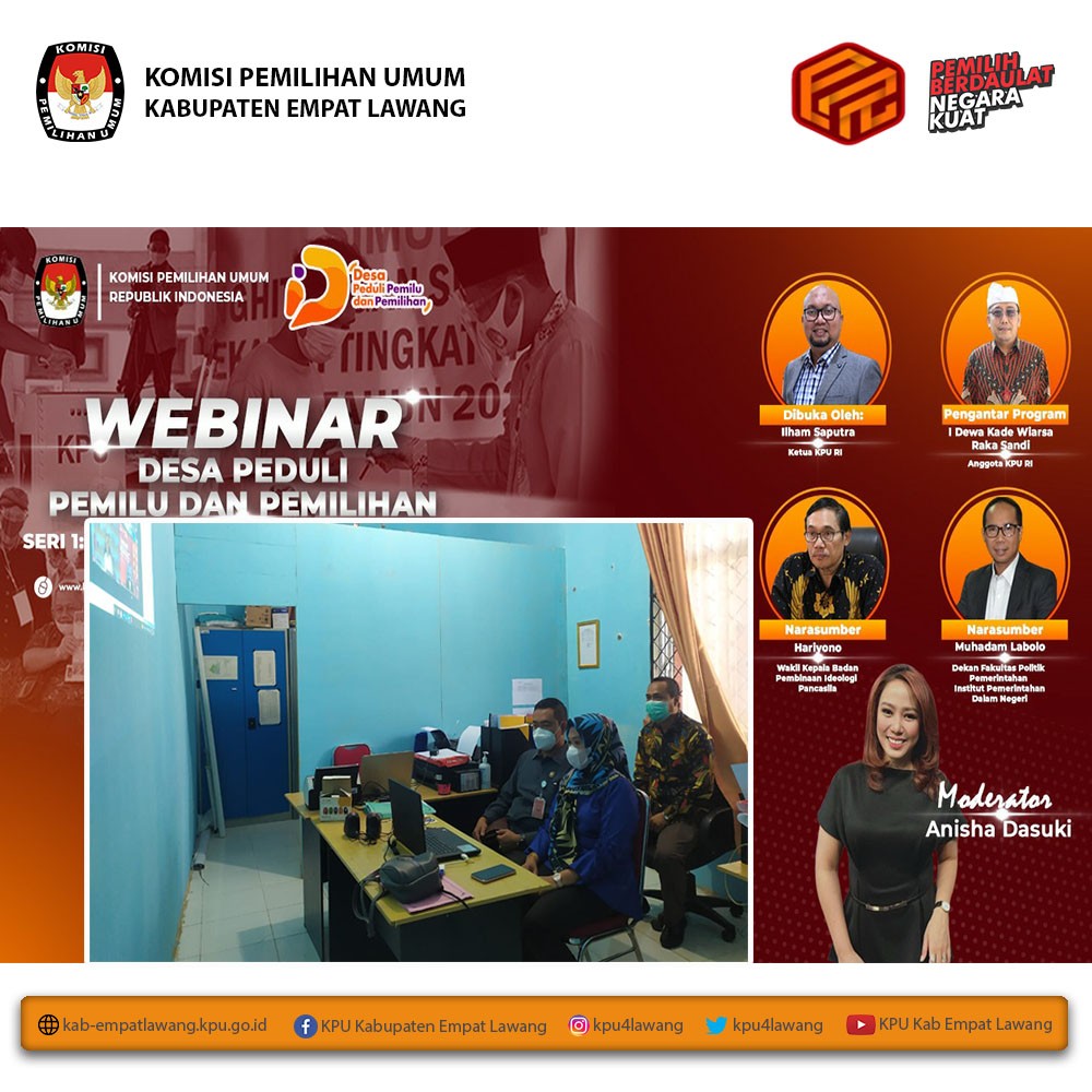 Ketua KPU Kabupaten Empat Lawang (Eskan Budiman, S.Pd) dan anggota KPU Kab Empat Lawang Divisi Sosialisasi, Pendidikan Pemilih, Parmas, dan SDM (Debi Yosiana, S.E.) serta Sub Koordinator Teknis Pemilu dan Hupmas (Yance Martin, S.H.) mengikuti "Webinar Desa Pemilu dan Pemilihan". Webinar dihadiri Ketua KPU RI (Ilham Saputra) dan Anggota KPU RI (I Dewa Kade Wiarsa Raka Sandi), dan sebagai narasumber Wakil Kepala Badan Pembinaan Ideologi Pancasila (Hariyono) dan Dekan Fakultas Politik Pemerintahan Institut Pemerintah Dalam Negeri (Muhadam Labolo). Webinar berlangsung melalui aplikasi zoom meeting mulai pukul 09.00 s.d selesai.