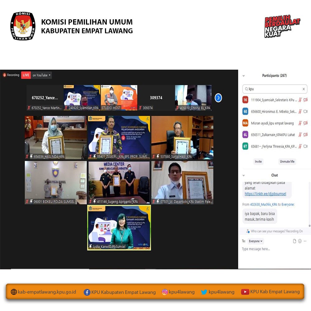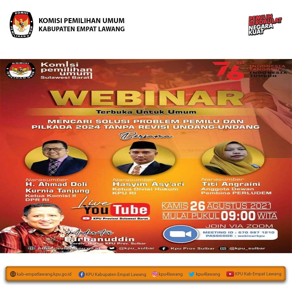 KPU Kabupaten Empat Lawang mengikuti webinar "Mencari Solusi Problem Pemilu dan Pilkada 2024 tanpa revisi Undang-Undang" yang diselenggarakan KPU Sulawesi Barat. Hadir sebagai narasumber H. Ahmad Doli Kurnia Tanjung Ketua Komisi II DPR RI, Hasyim Asy'ari Anggota Divisi Hukum KPU RI, dan Titi Angraini Anggota Dewan Pembina PERLUDEM. Webinar berlangsung melalui daring via zoom meeting, dimulai pukul 09.00 WITA s.d selesai.