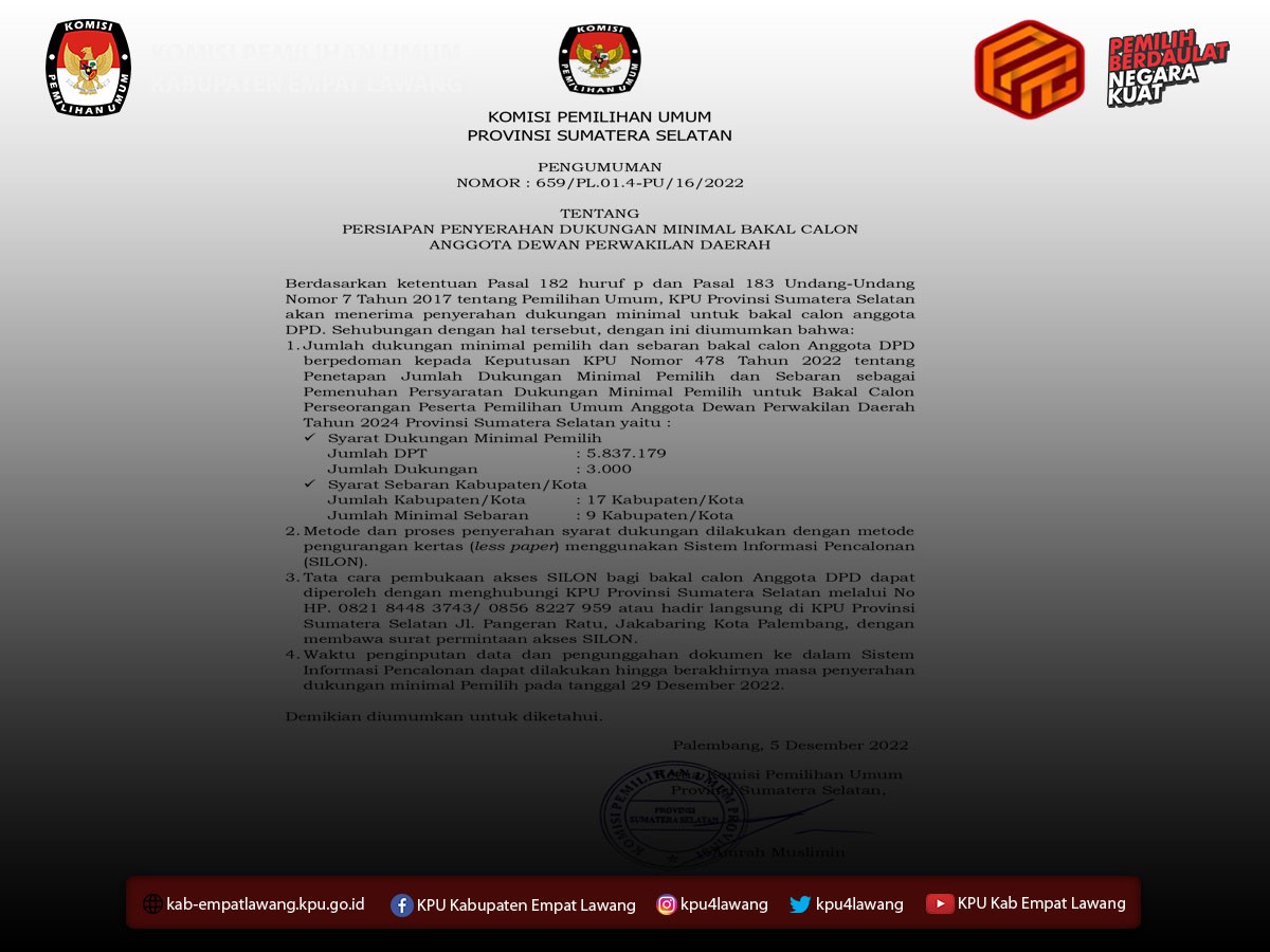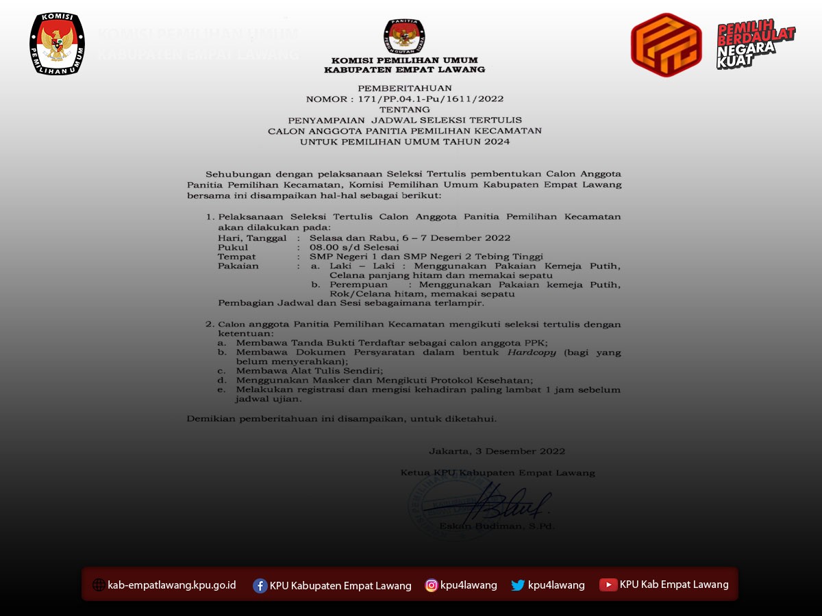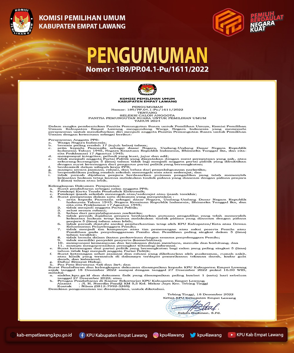 #TemanPemilih, berikut Pengumuman tentang Seleksi Calon Anggota Panitia Pemungutan Suara (PPS) untuk Pemilihan Umum Tahun 2024.