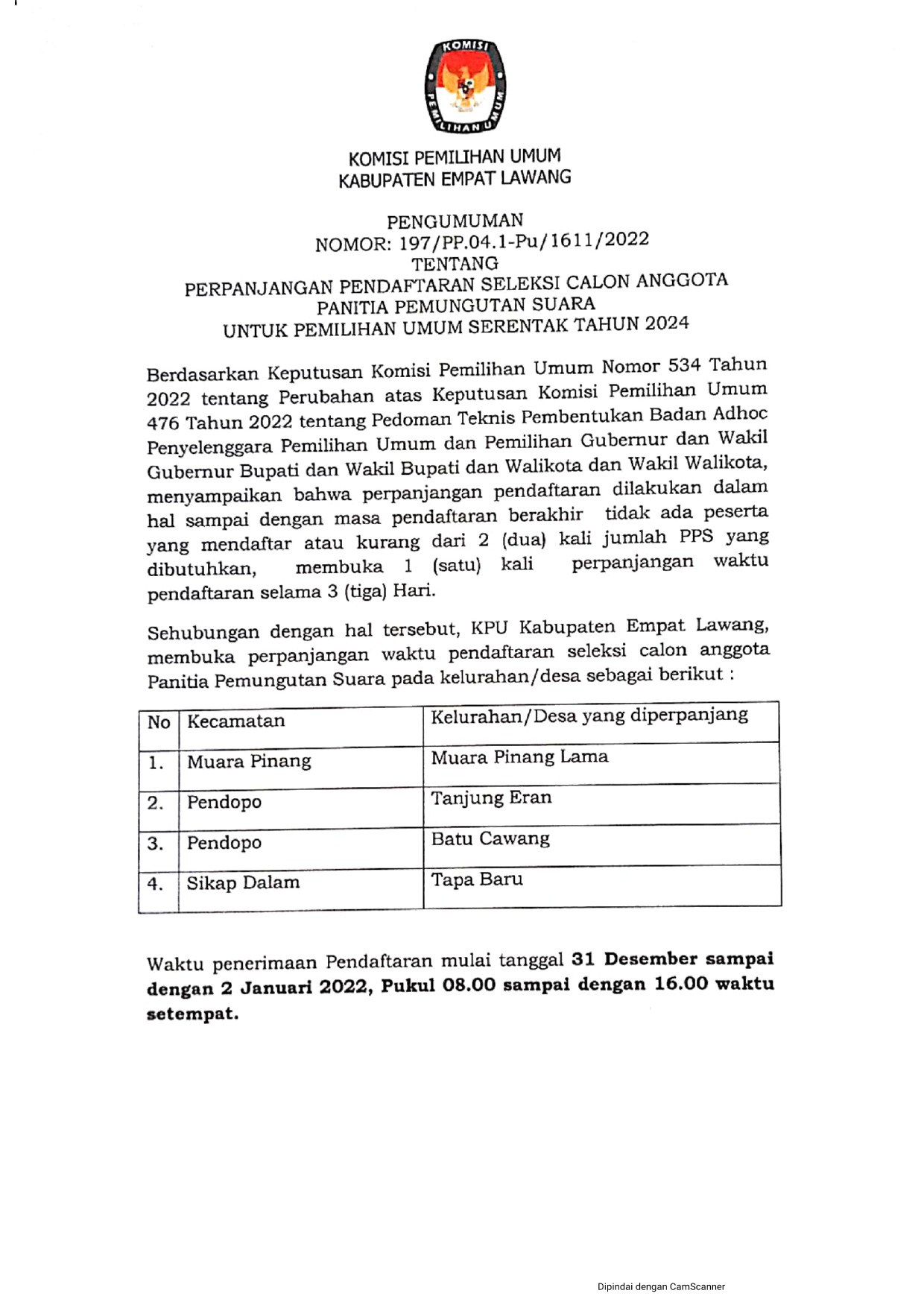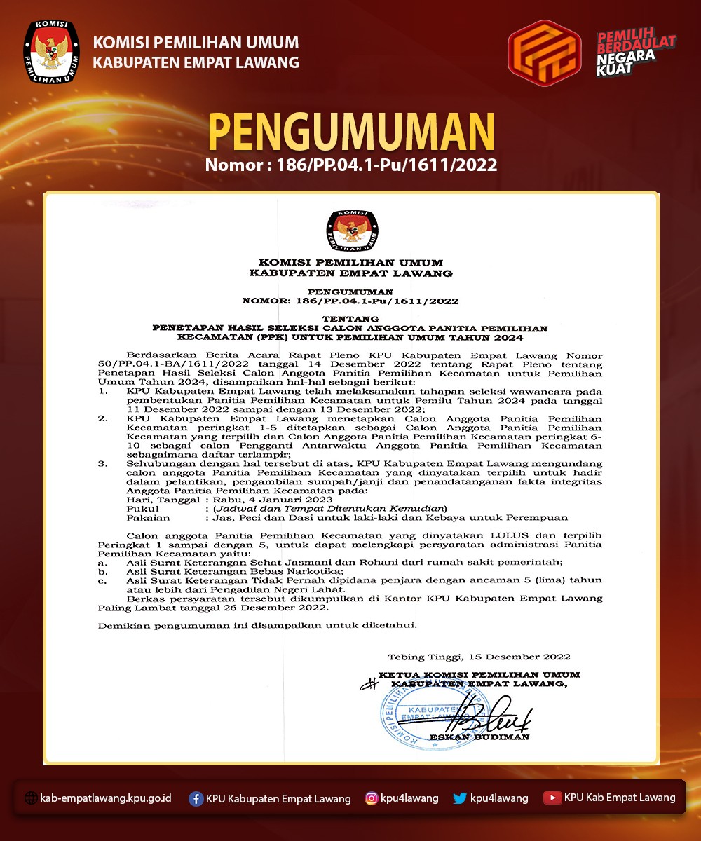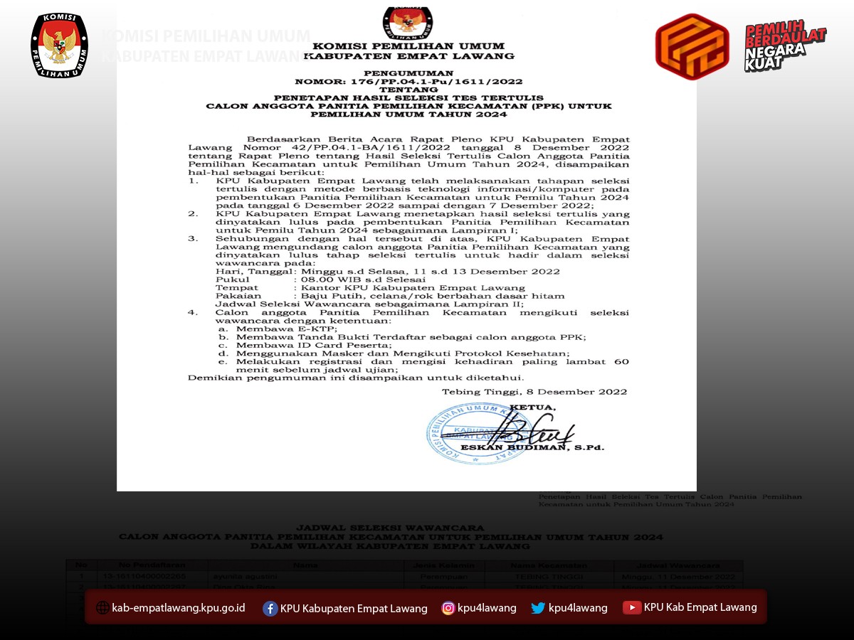 Pengumuman tentang Seleksi Calon Anggota Panitia Pemungutan Suara (PPS) untuk Pemilihan Umum Tahun 2024
