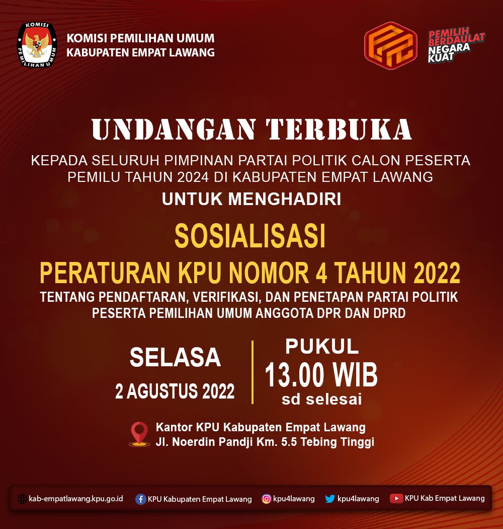 #TemanPemilih, KPU Kabupaten Empat Lawang Mengundang kepada Seluruh Pimpinan Partai Politik Calon Peserta Pemilu 2024 Tingkat Kabupaten Empat Lawang untuk menghadiri :
