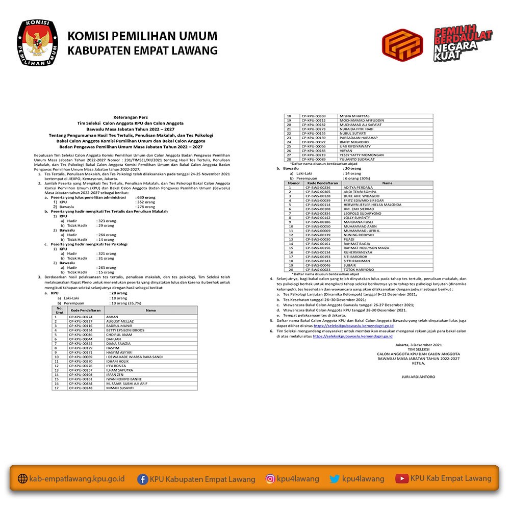 Tentang Pengumuman Hasil Tes Tertulis, Penulisan Makalah, dan Tes Psikologi Bakal Calon Anggota Komisi Pemilihan Umum dan Bakal Calon Anggota Badan Pengawas Pemilihan Umum Masa Jabatan Tahun 2022 – 2027