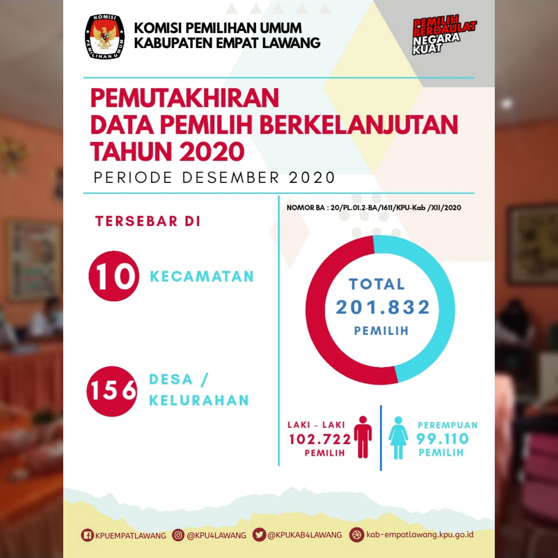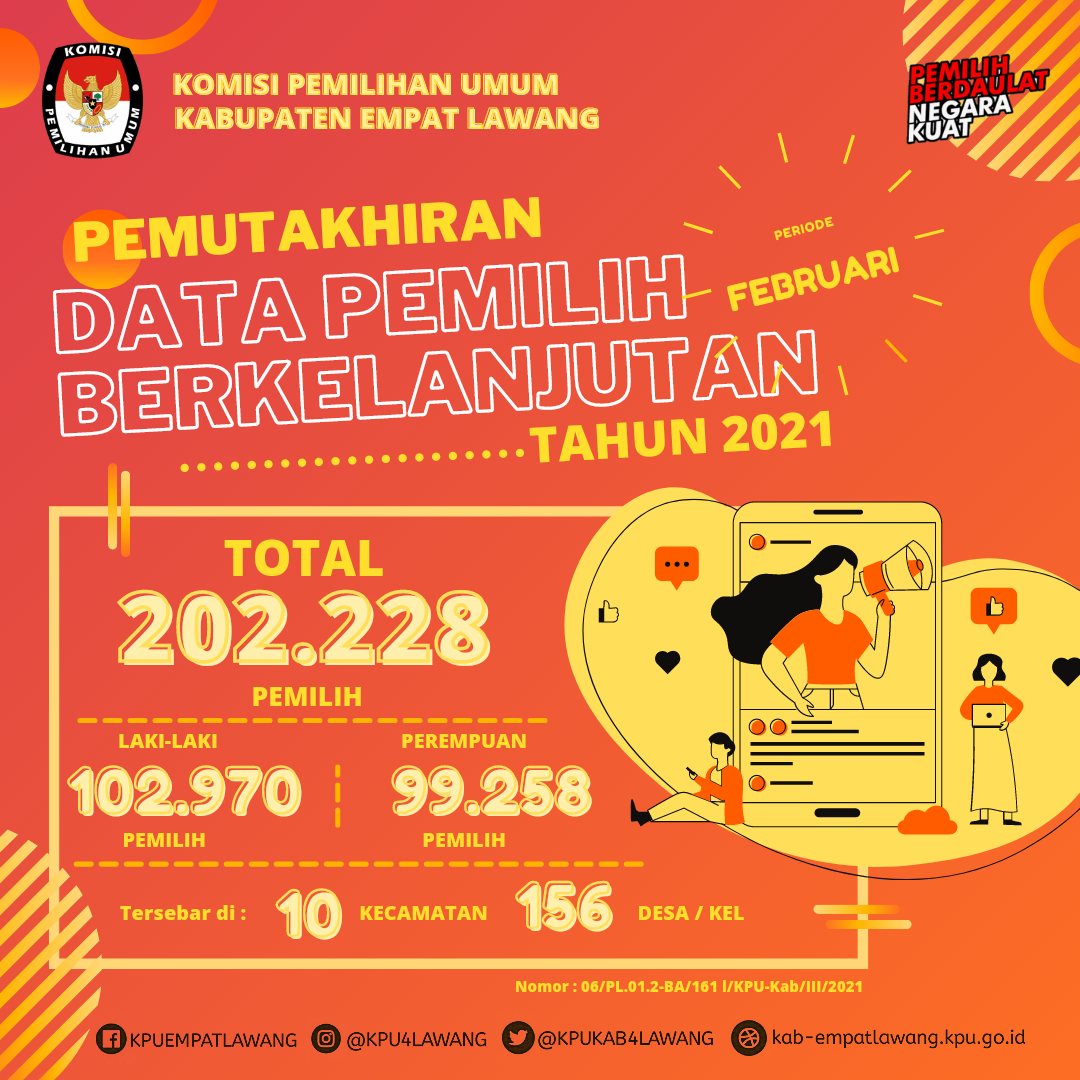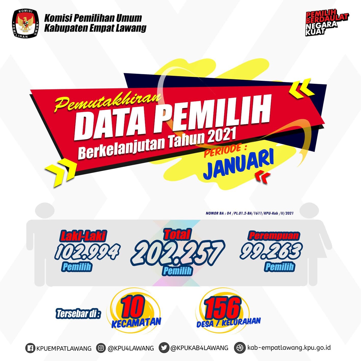 KPU Kabupaten Empat Lawang Mengumumkan Pemutakhiran Data Pemilih Berkelanjutan Periode Bulan Januari Tahun 2021, setelah melakukan Rapat Pleno pada Senin 8 Februari 2021, yang dihadiri oleh Bawaslu Kabupaten Empat Lawang, Dandim 0405 Lahat, Polres Empat Lawang, Didukcapil Kabupaten Empat Lawang, Kemenag Empat Lawang, Kesbangpol Kabupaten Empat Lawang, BPMPD dan Partai Politik di Kantor KPU Kabupaten Empat Lawang.