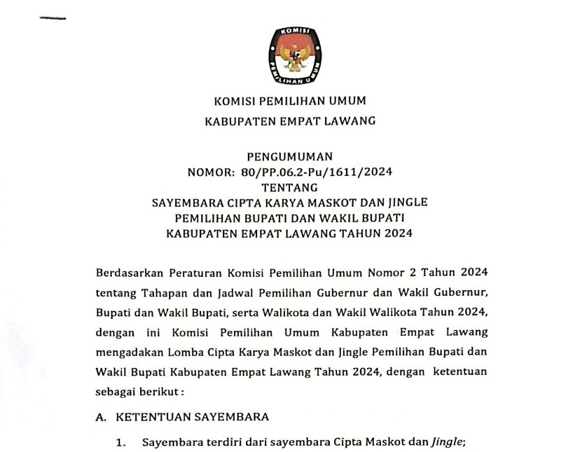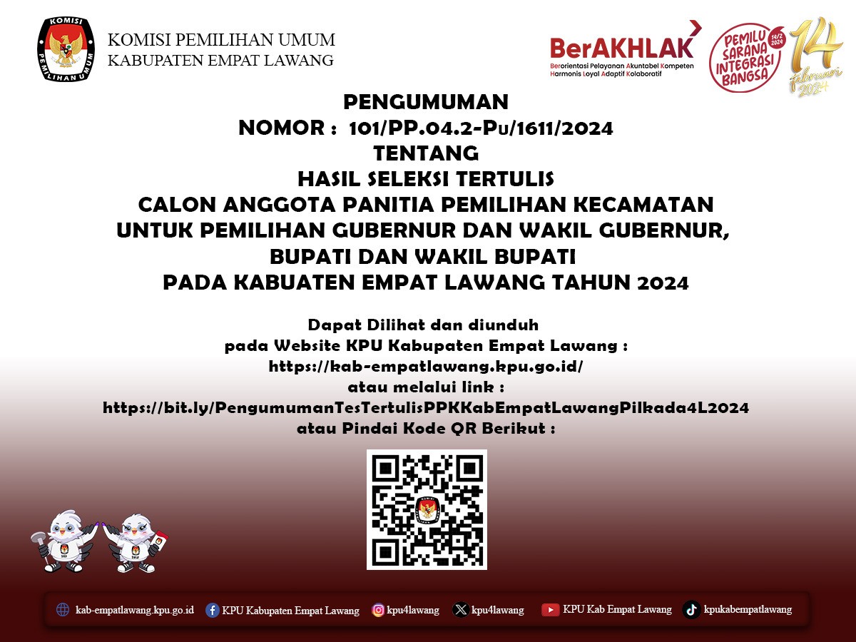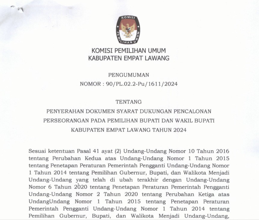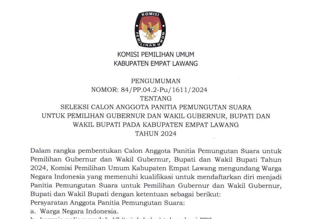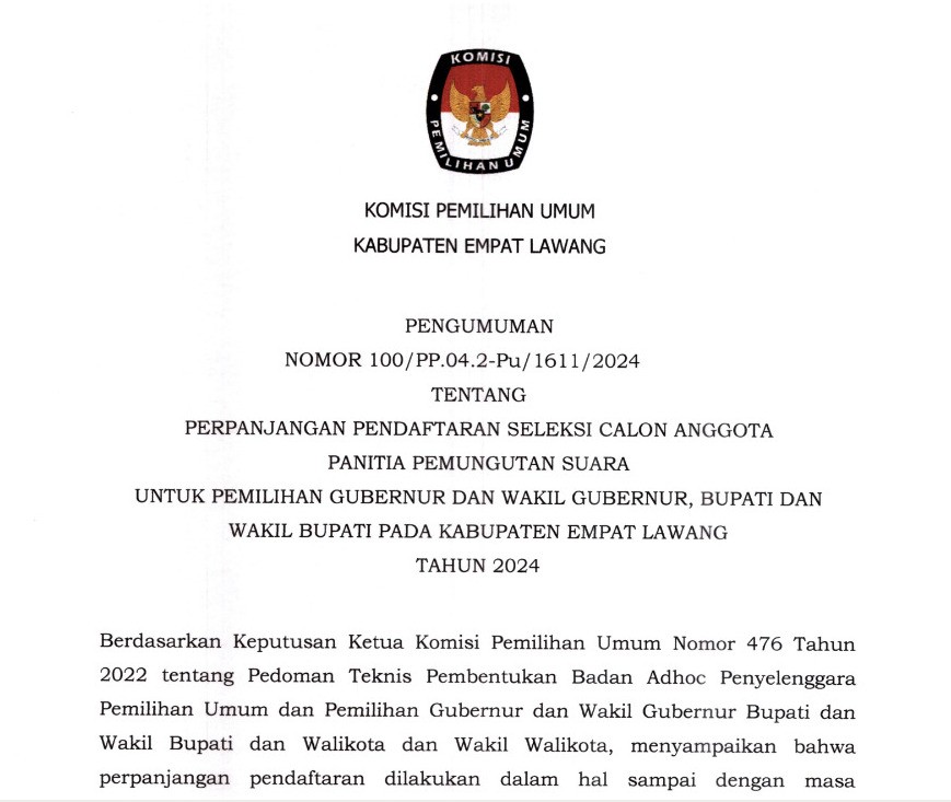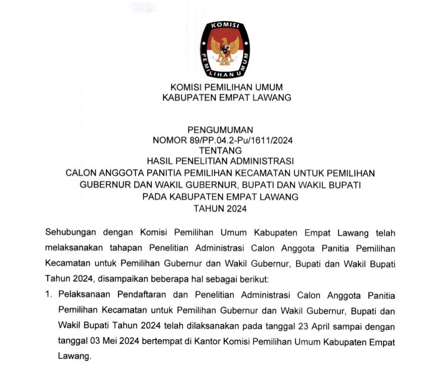 Pengumuman Hasil Penelitian Administrasi Calon Anggota PPK untuk Pemilihan Gubernur dan Wakil Gubernur, Bupati dan Wakil Bupati pada Kabupaten Empat Lawang Tahun 2024