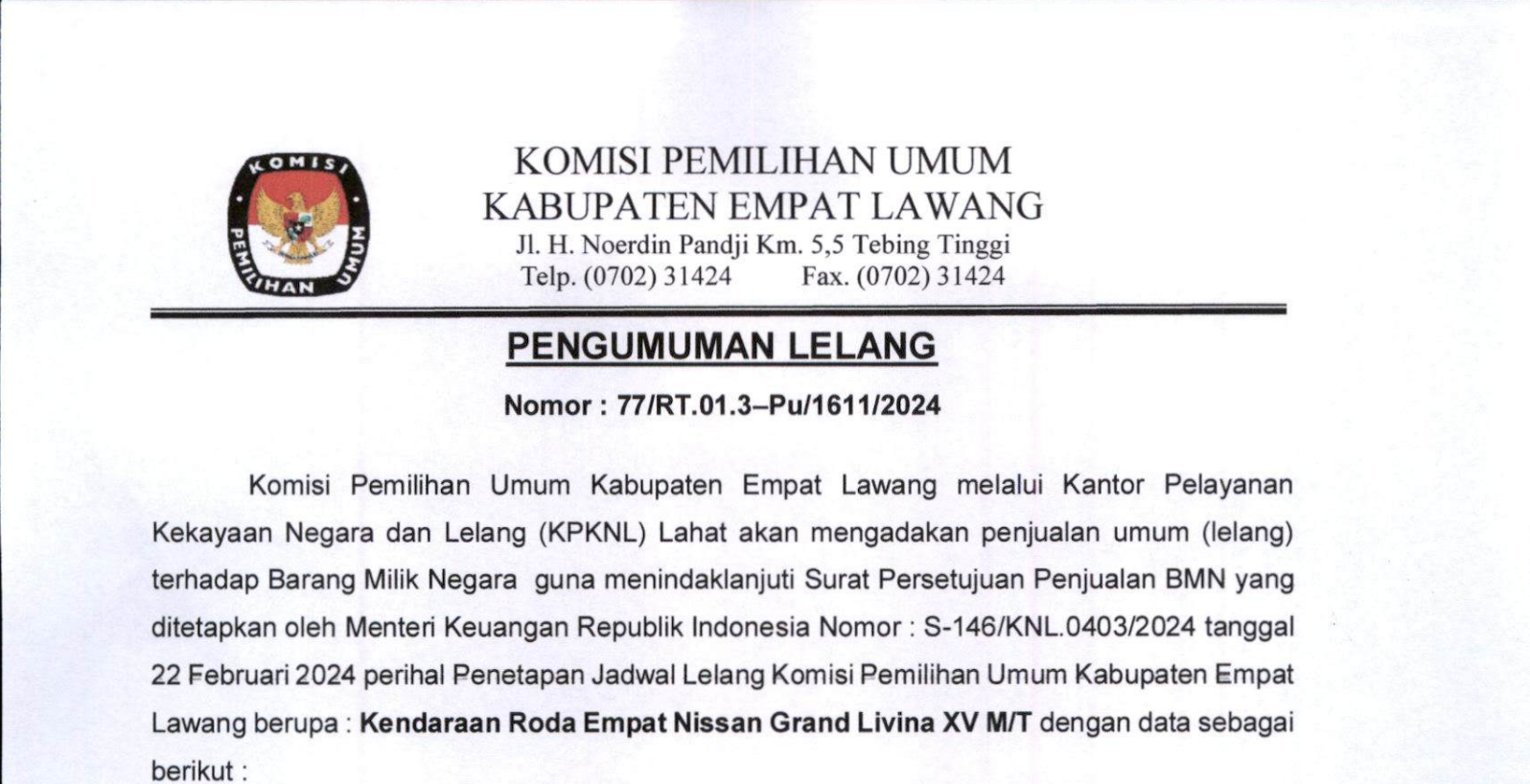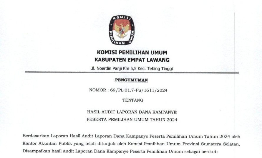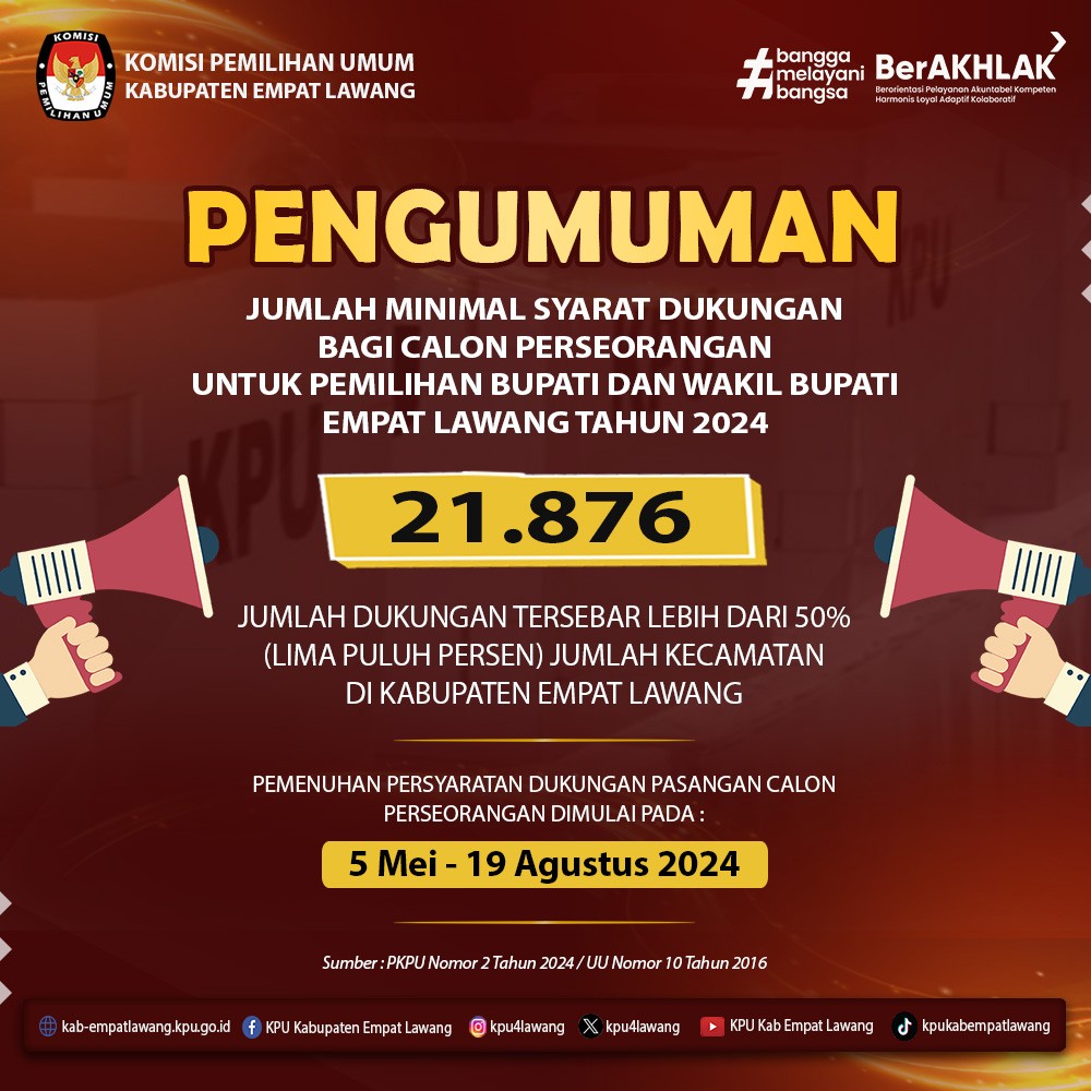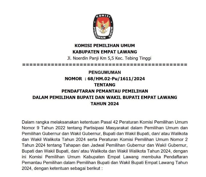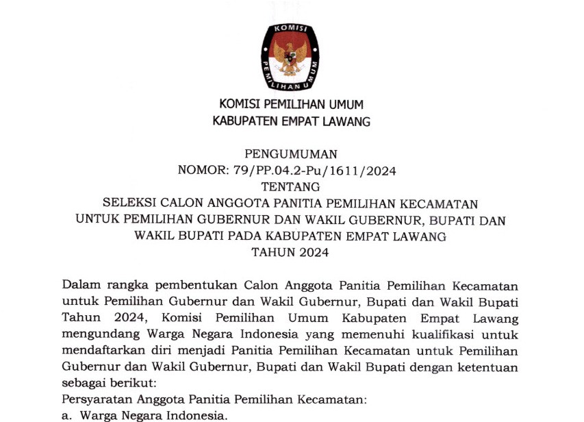 Pengumuman Seleksi Calon Anggota PPK untuk Pemilihan Gubernur dan Wakil Gubernur, Bupati dan Wakil Bupati pada Kabupaten Empat Lawang Tahun 2024