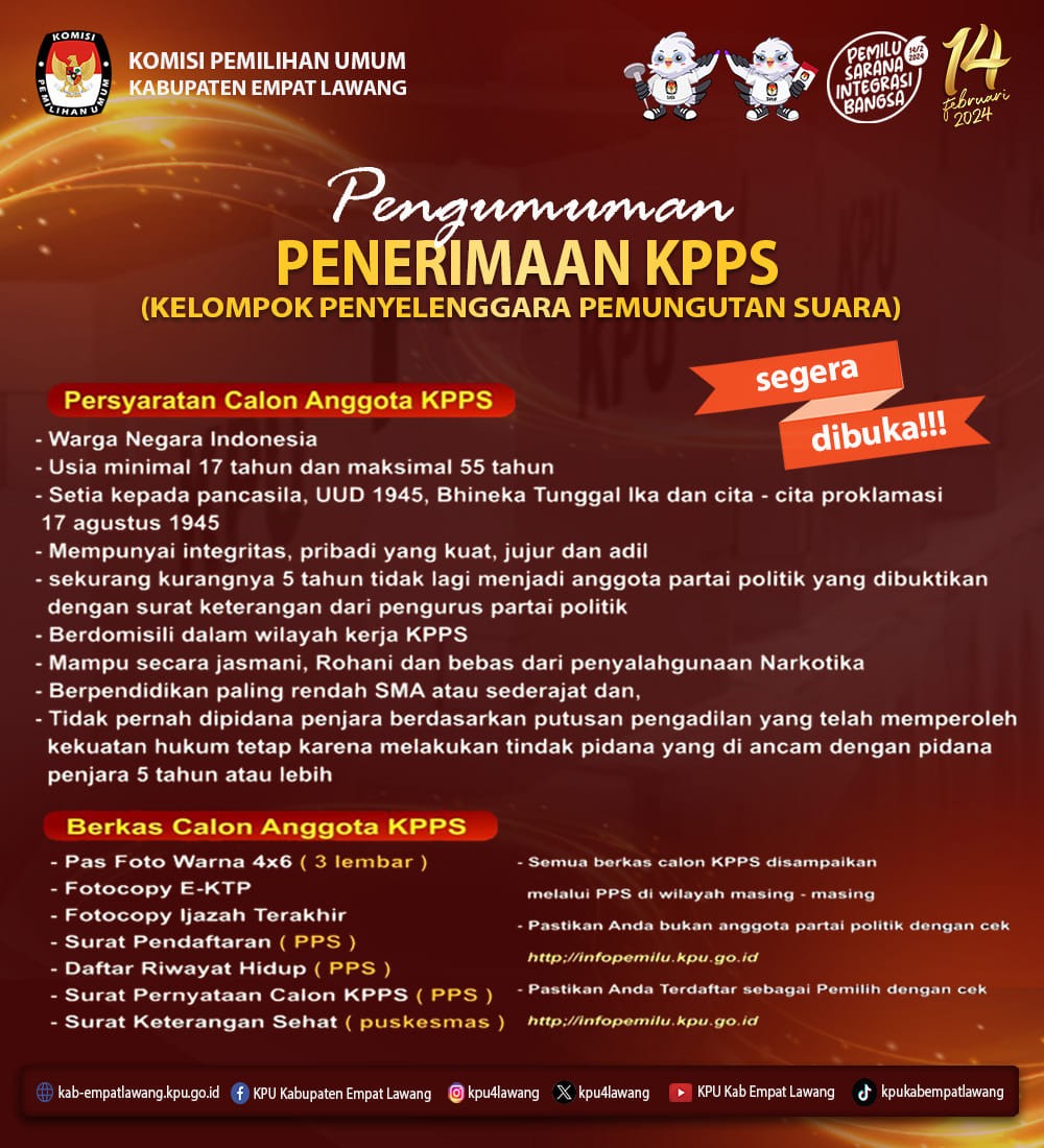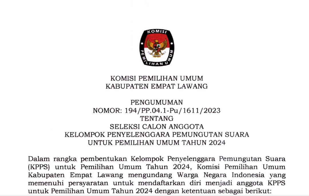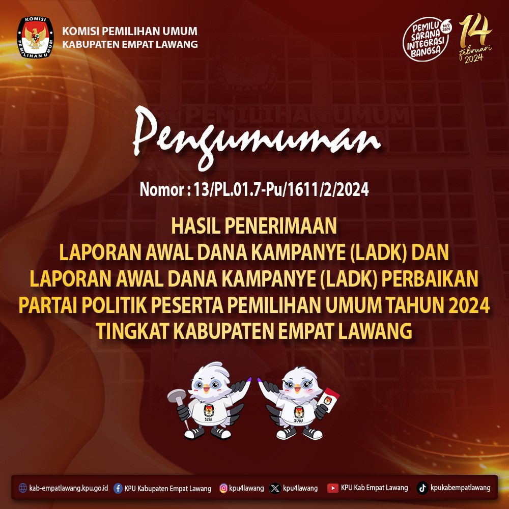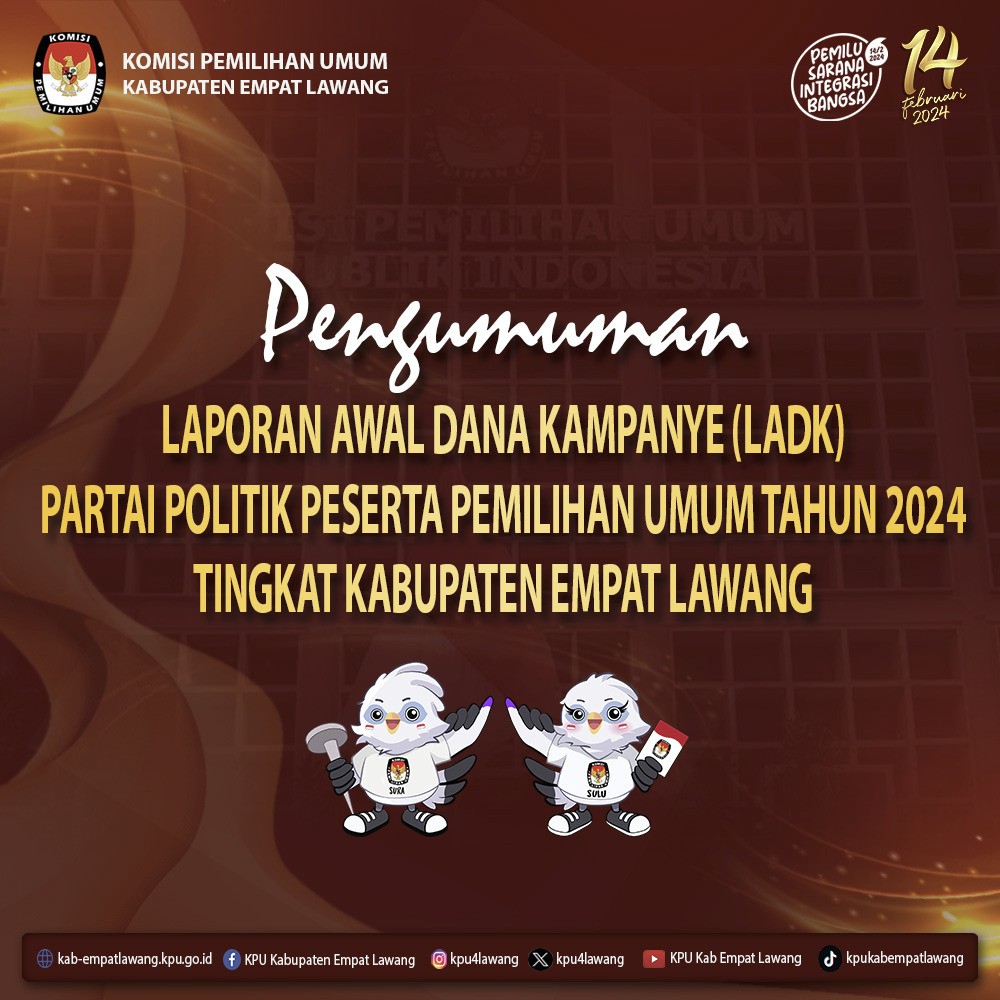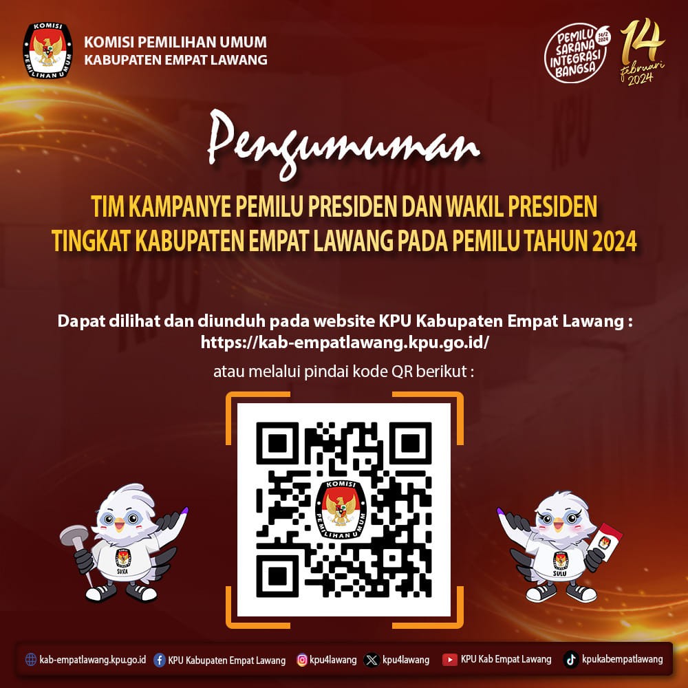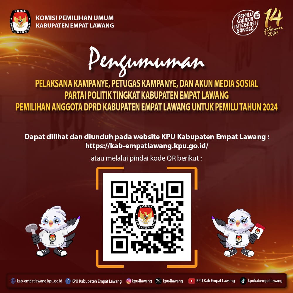 #TemanPemilih, berikut pengumuman pelaksana kampanye, petugas kampanye, dan akun media sosial partai politik tingkat kabupaten Empat Lawang pemilihan anggota DPRD tingkat kabupaten Empat Lawang untuk pemilu tahun 2024.