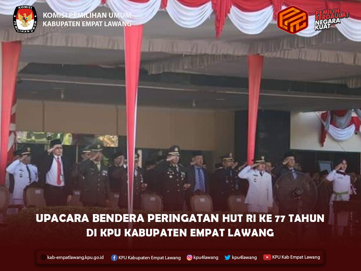 Anggota KPU Kabupaten Empat Lawang serta sekretariat melaksanakan Upacara Peringatan HUT Republik Indonesia ke 77 Tahun secara luring di halaman kantor KPU Kabupaten Empat Lawang.