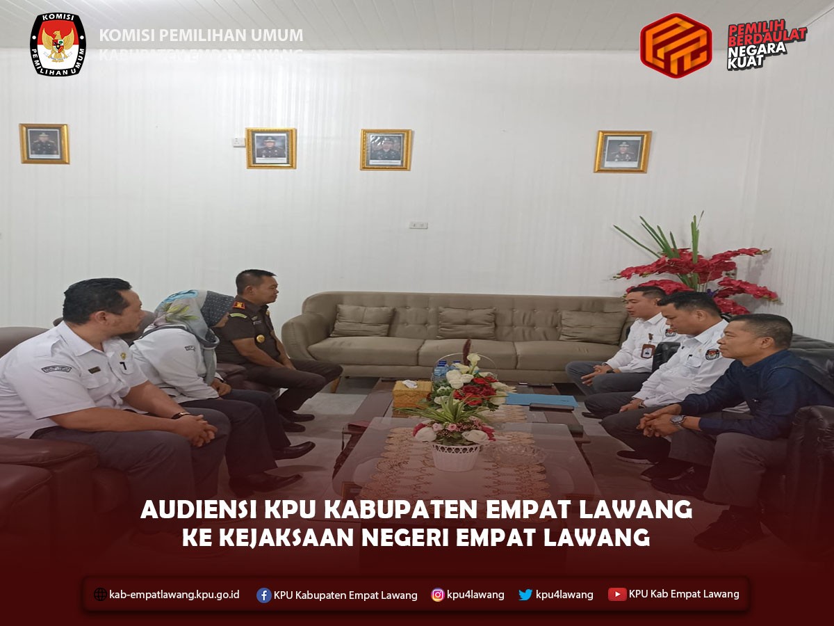 #TemanPemilih, Ketua dan Anggota KPU Kabupaten Empat Lawang Eskan Budiman dan Abu Yamin melakukan Audiensi ke Kejaksaan Negeri Empat Lawang didampingi Sekretaris Kabupaten Empat Lawang Misran Ayudi, Kasubbag Perencanaan Data dan Informasi Desi Elhawati, Kaubbag Keungan Umum dan Logistik Rosmelianti, dan Kasubbag Hukum dan SDM Sulaimanto Wibowo pada Senin 26/12/2022.
