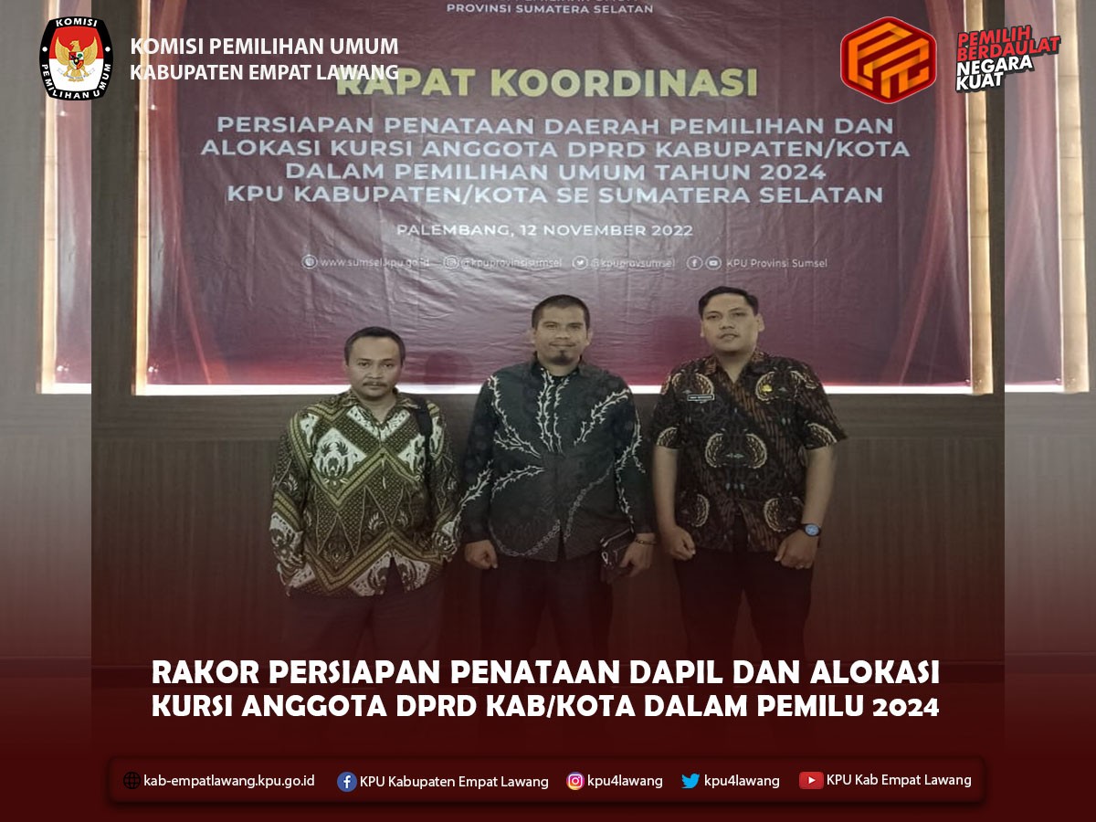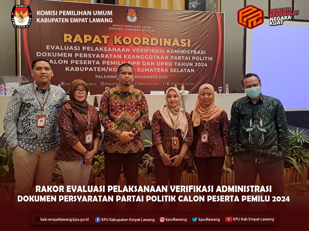 #TemanPemilih, KPU Kab Empat Lawang mengikuti Rapat Koordinasi Evaluasi Pelaksanaan Verifikasi Administrasi Dokumen Persyaratan Keanggotaan Partai Politik Calon Peserta Pemilu 2024. Kegitan yang diselenggarakan KPU Prov Sumatera Selatan ini diikuti oleh Anggota KPU Kab Empat Lawang Hendra Gunawan, S.HI., M.Ag., Kasubbag Teknis dan Hupmas Yance Martin, S.H., serta operatar SIPOL, dan diikuti juga oleh KPU Kab/Kota se-Sumatera Selatan. Kegiatan berlangsung dari 7-9 November 2022 di Hotel Santika Premiere Palembang.