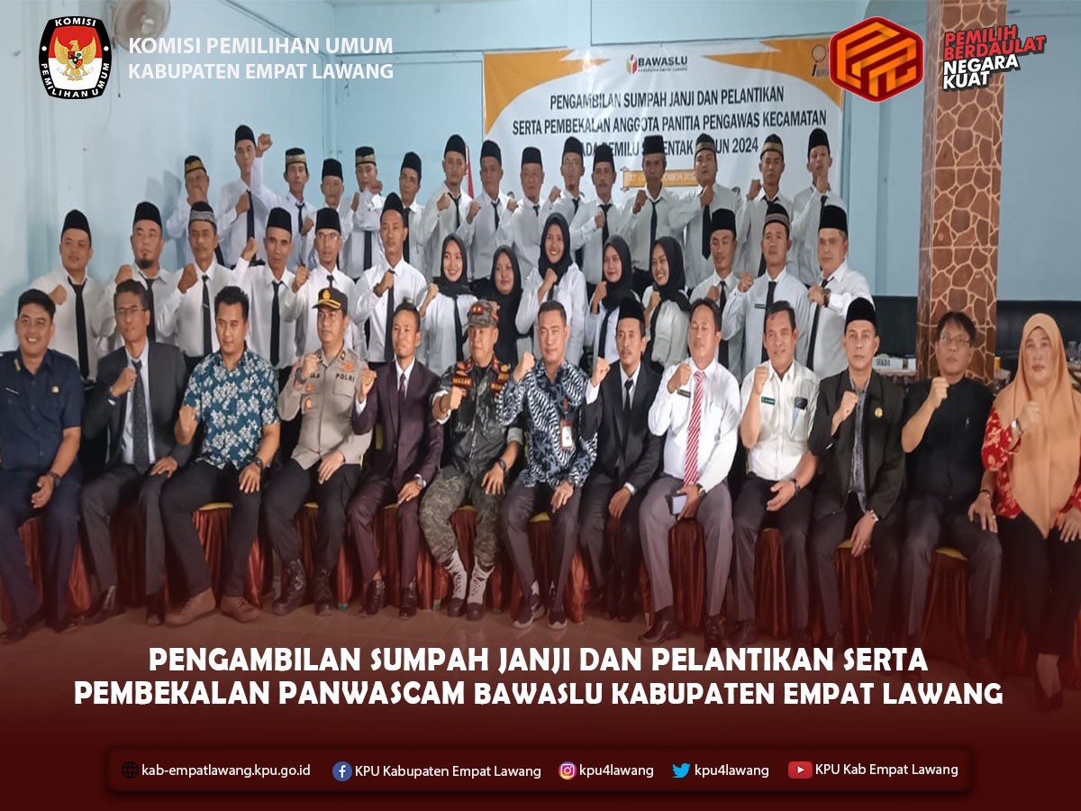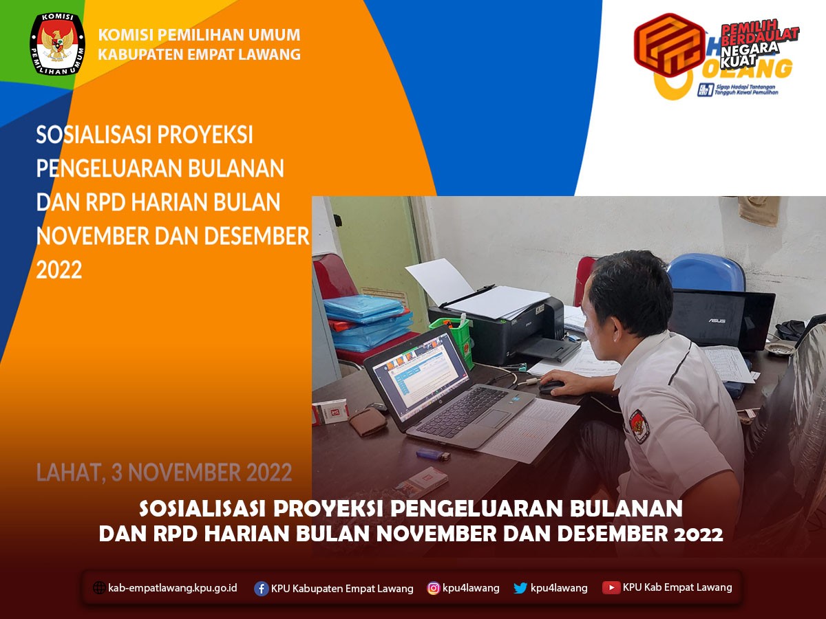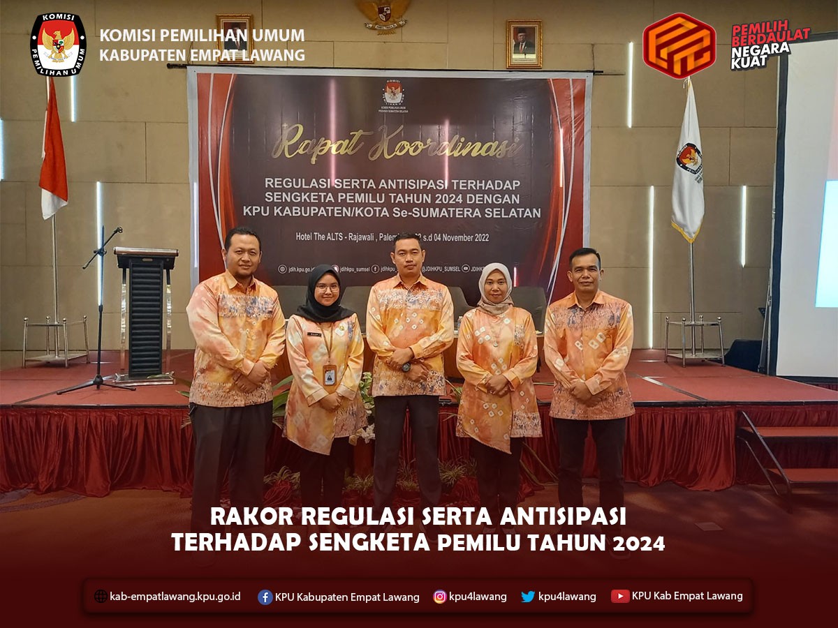 #TemanPemilih, Ketua KPU Kabupaten Empat Lawang Eskan Budiman, S.Pd., Anggota KPU Debi Yosiana, SE., dan Ali Amin, SH., serta Kasubbag Hukum dan SDM mengikuti Rapat Koordinasi Regulasi serta Antisipasi Terhadap Sengketa Pemilu Tahun 2024. Kegiatan yang diselenggarakan KPU Provinsi Sumatera Selatan diikuti oleh KPU Kab/Kota Se-Sumatera Selatan, bertempat di Hotel The Alts Palembang dari tanggal 2 - 4 November 2022.