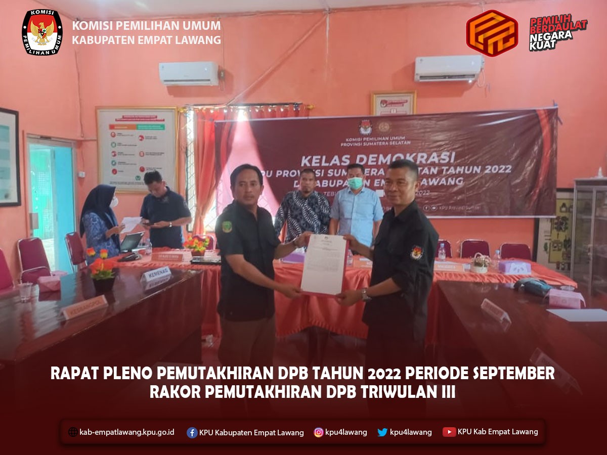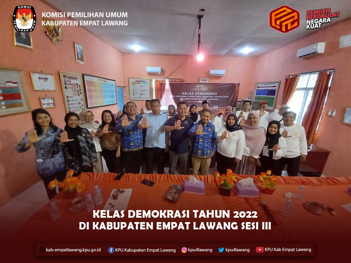 Pertemuan ke III ini merupakan pertemuan terkakhir kegiatan Kelas Demokrasi Tahun 2022 di Kabupaten Empat Lawang. Kelas Demokrasi hari ini materinya di isi oleh narasumber : Perwakilan Kepala Dinas Pendudukan dan Pencatatan Sipil Kabupaten Empat Lawang, Akademisi (Ngimadudin, S.Ag. MH.), Anggota KPU Kabupaten Empat Lawang (Abu Yamin, S.Kom.) dan Kasubbag Hukum dan SDM (Sulaimanto Wibowo, SH). Kelas Demokrasi Sesi Terakhir ini ditutup oleh Ketua KPU Kabupaten Empat Lawang (Eskan Budiman, S.Pd.).